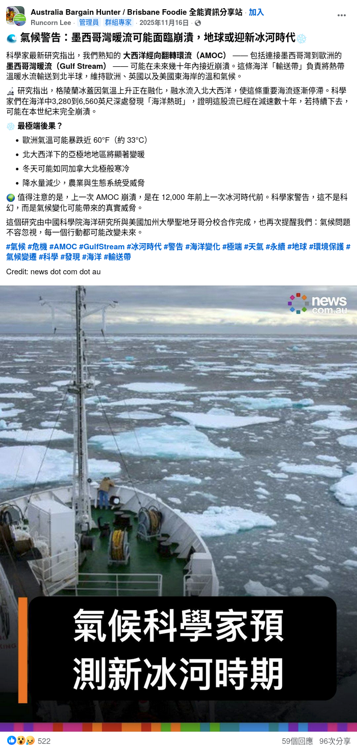 2025年11月15日,Facebook群組「Australia Bargain Hunter / Brisbane Foodie 全能資訊分享站」的管理員「Runcorn Lee」於該群組發佈帖文,表示「科學家最新研究」指出大西洋經向翻轉環流(AMOC)「可能在未來幾十年內接近崩潰」以及「地球或迎新冰河時代」。帖文獲得522個表情反應、59個留言及96次分享。