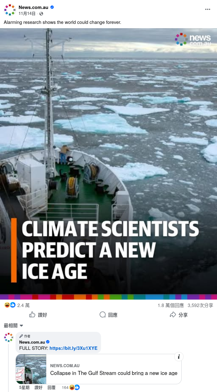 - 有FB帖文表示,一項最新研究指出大西洋經向翻轉環流(AMOC)「可能在未來幾十年內接近崩潰」,又稱「地球或迎新冰河時代」。有用戶留言質疑說法跟全球暖化的現象不符。