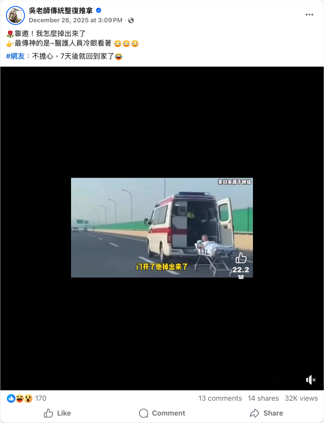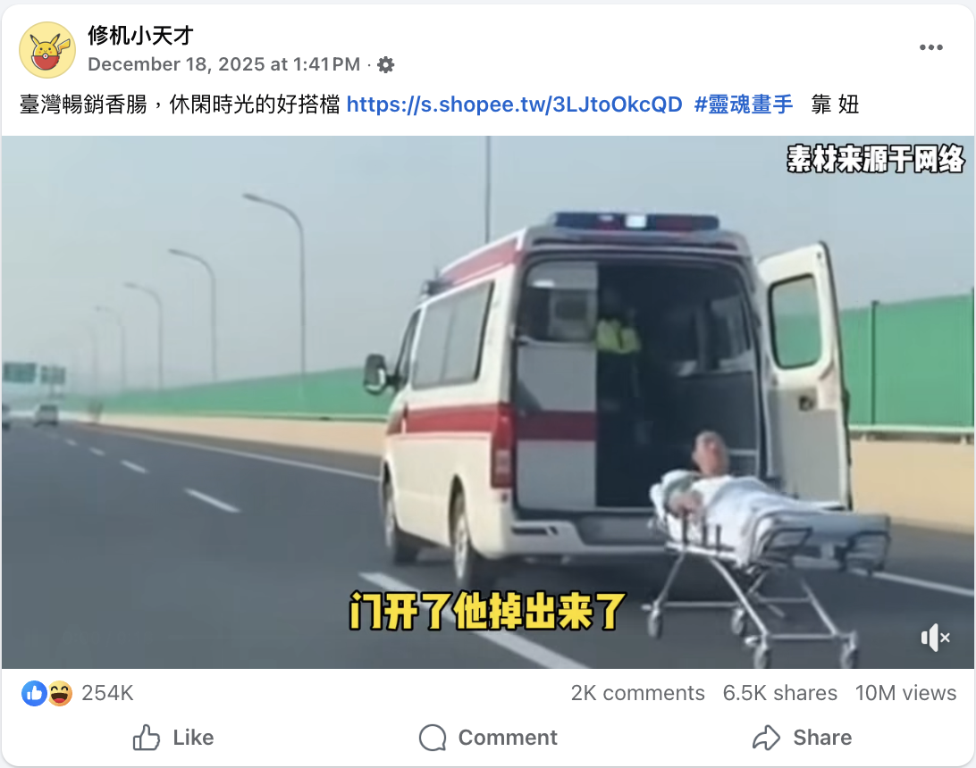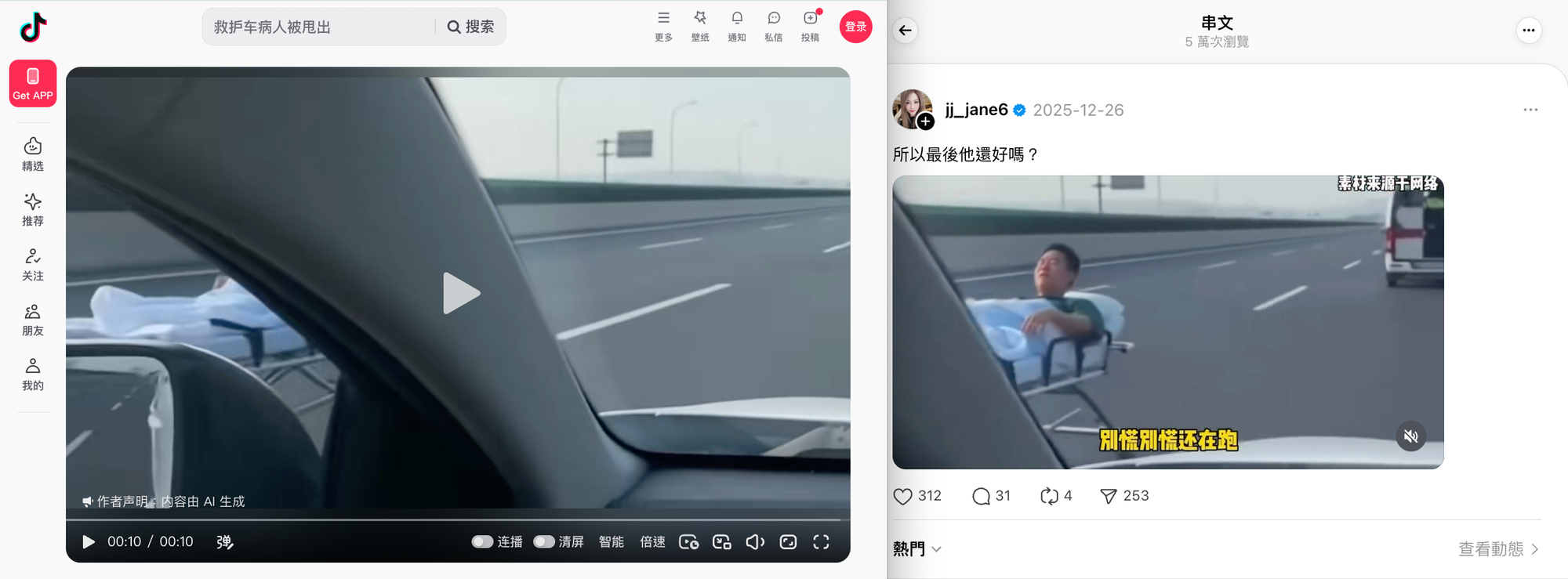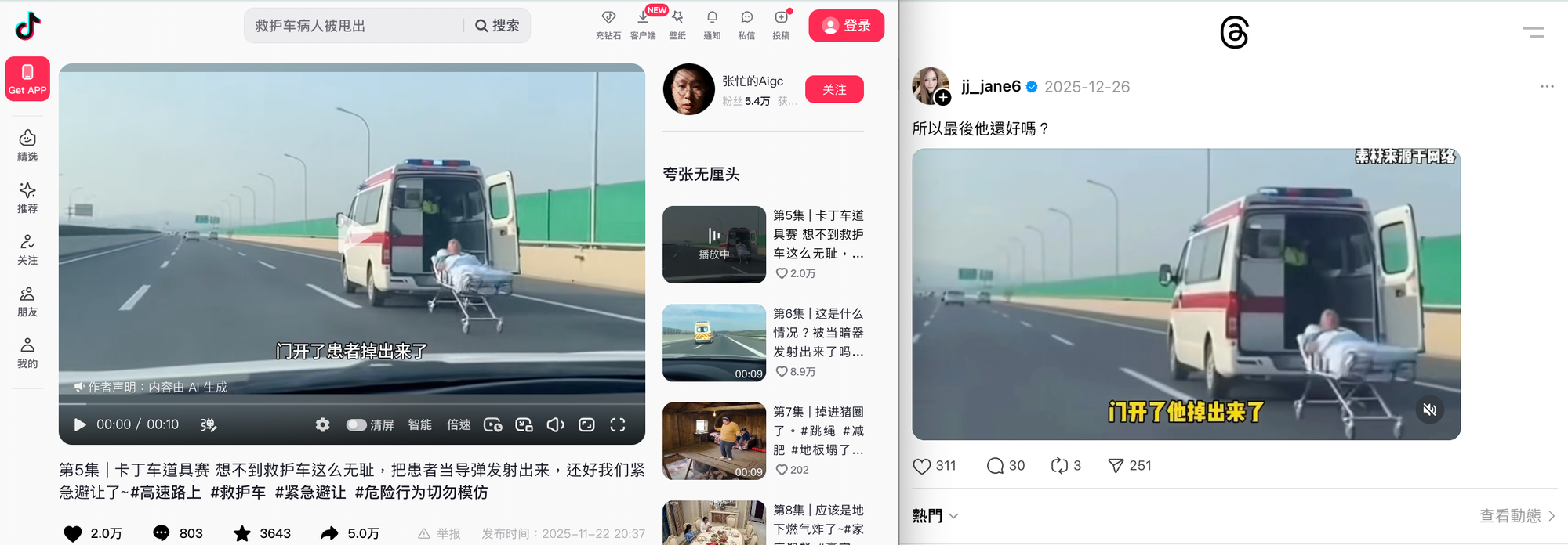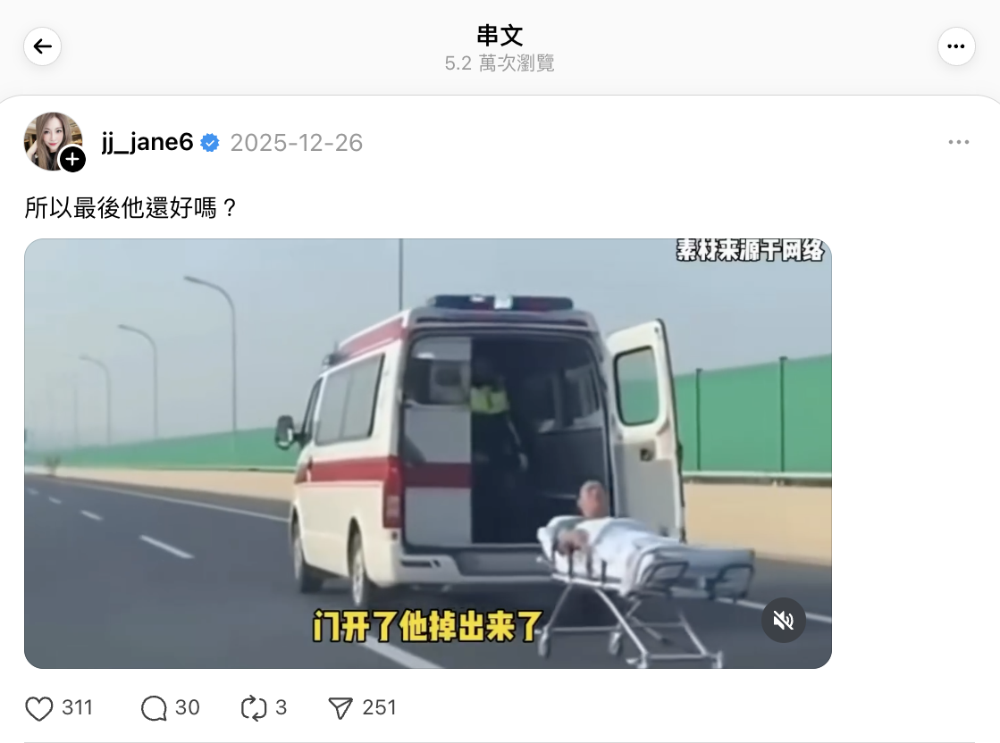 2025年12月26日,Threads用戶「jj_jane6」發佈帖文並分享影片,片中一輛救護車在公路上行駛,車尾門打開,一位病人連同擔架床從車上掉下,擔架床繼續滑行。影片出現3次黑白漫畫風的定格畫面,右上註明「素材来源于网络」。影片合計獲得311個表情反應、30個留言、254次轉發分享以及逾5.2萬次查看。 帖文留言顯示「jj_jane6」及部分用戶認為影片屬實。[1]