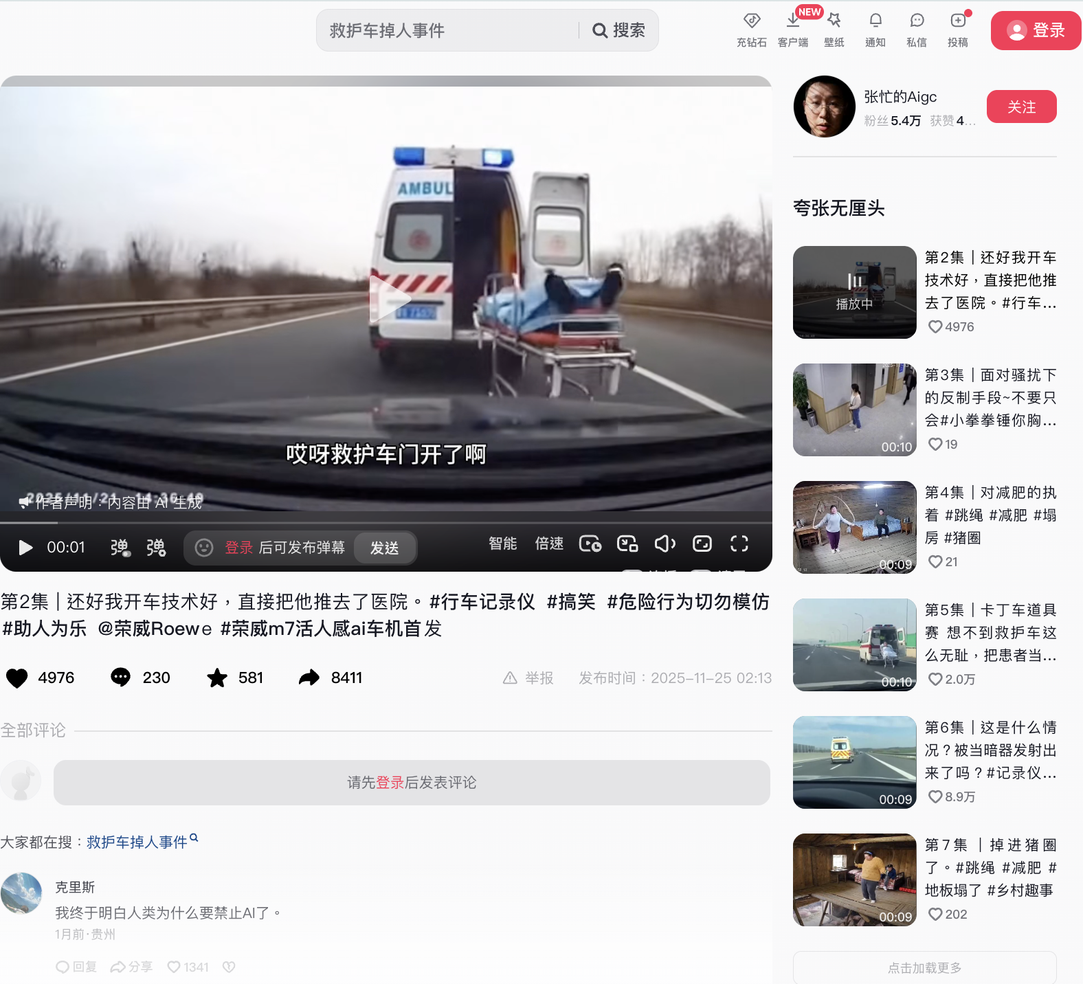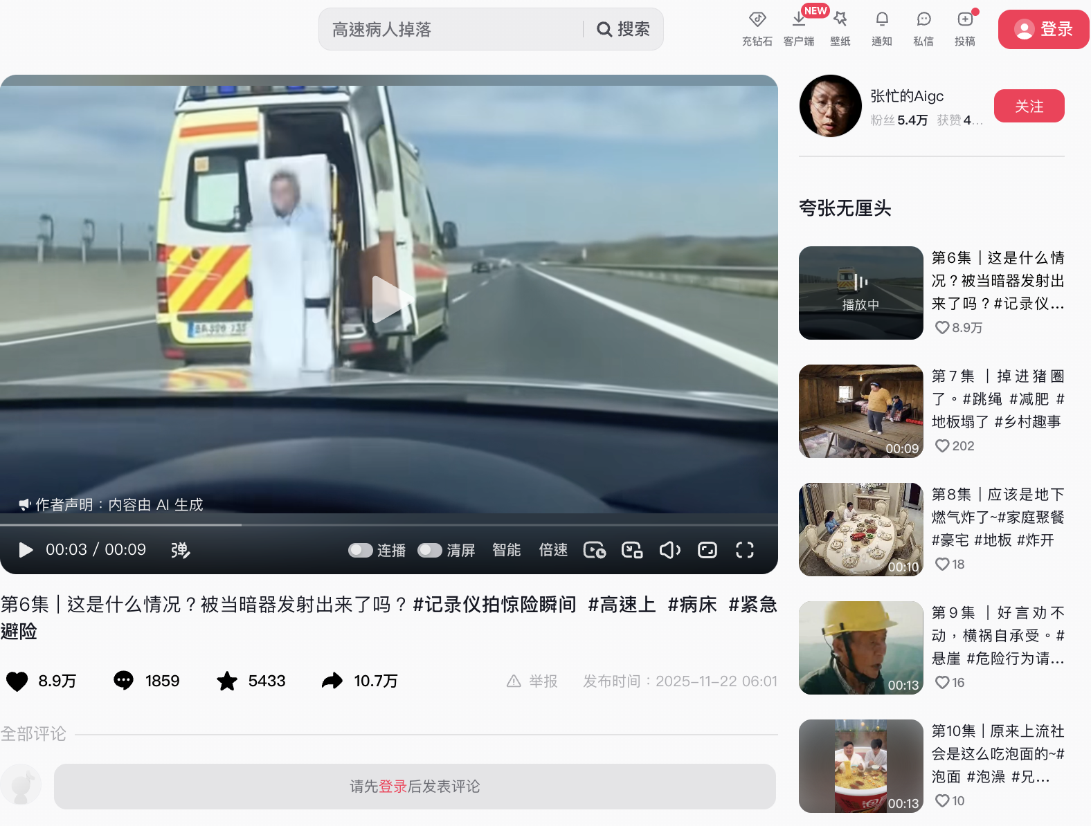 另外,「张忙的Aigc」在個人主頁介紹稱發佈的大多數影片都是AI生成。[5]該用戶於2025年11月22日及25日發佈了兩條病人連同擔架床從救護車上掉下的影片(見圖6、7),同樣註明内容由AI生成。[6,7]