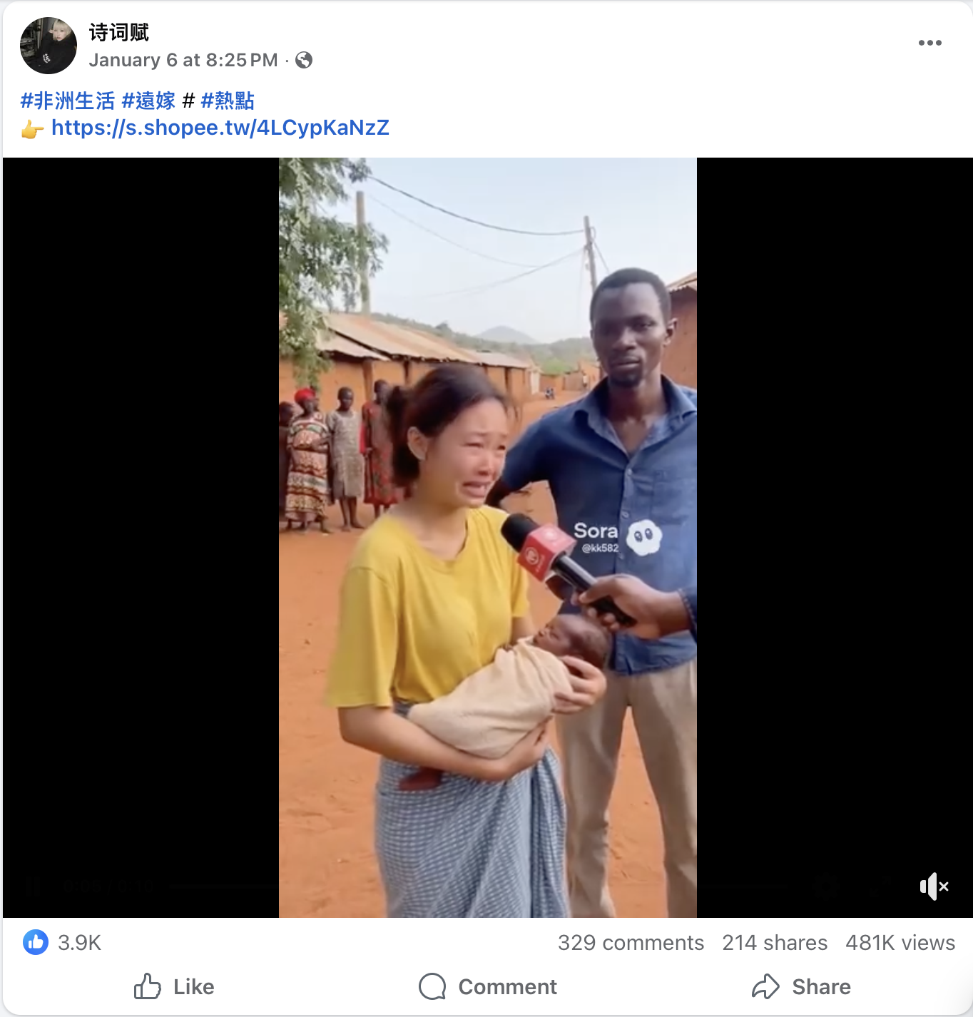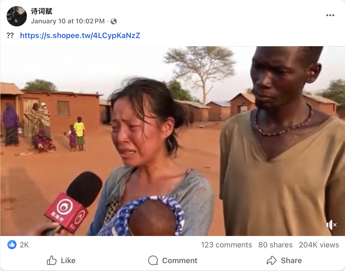 - Facebook流傳多段一名女子抱著嬰兒受訪,以普通話哭訴非洲生活艱難的影片。