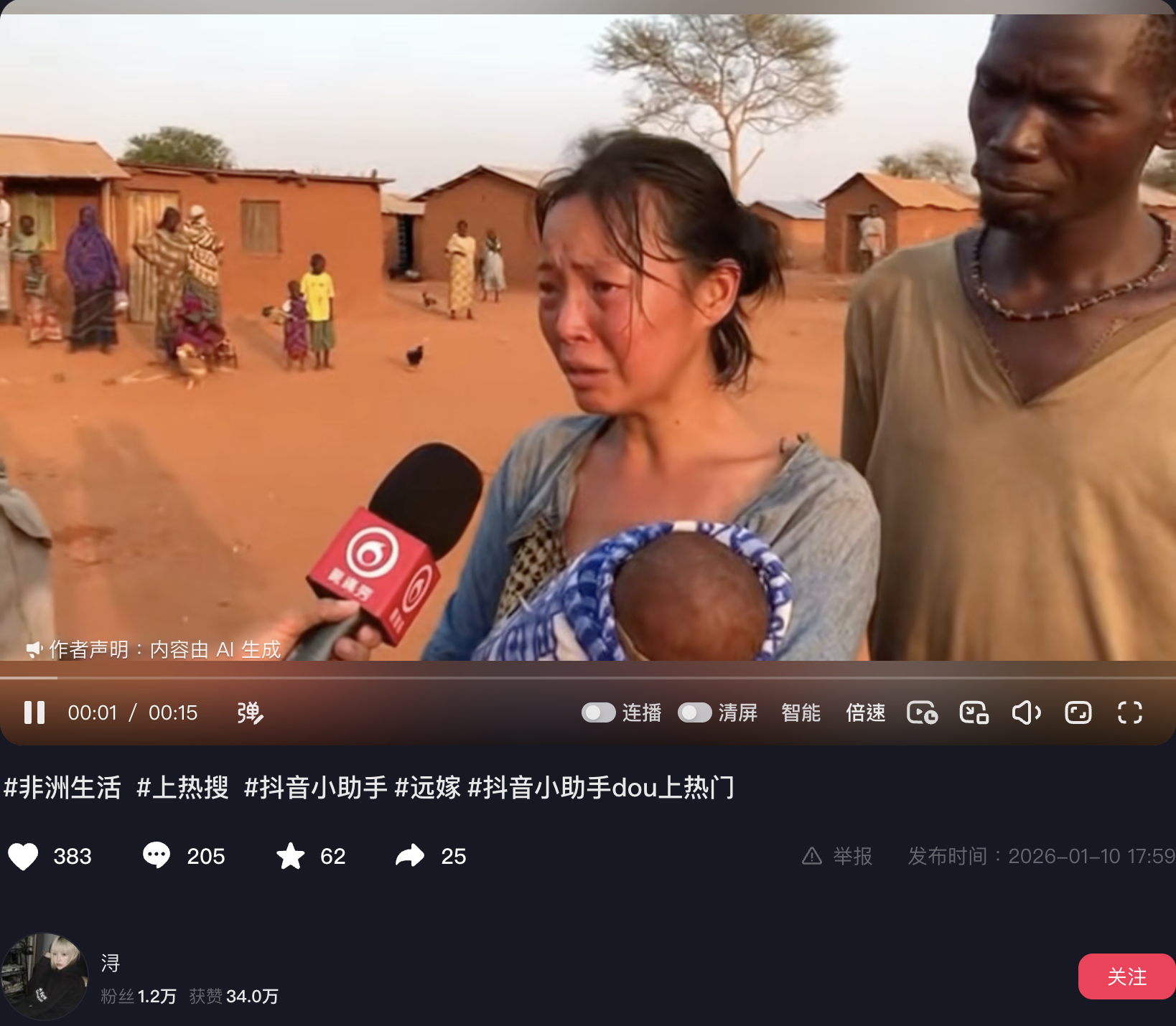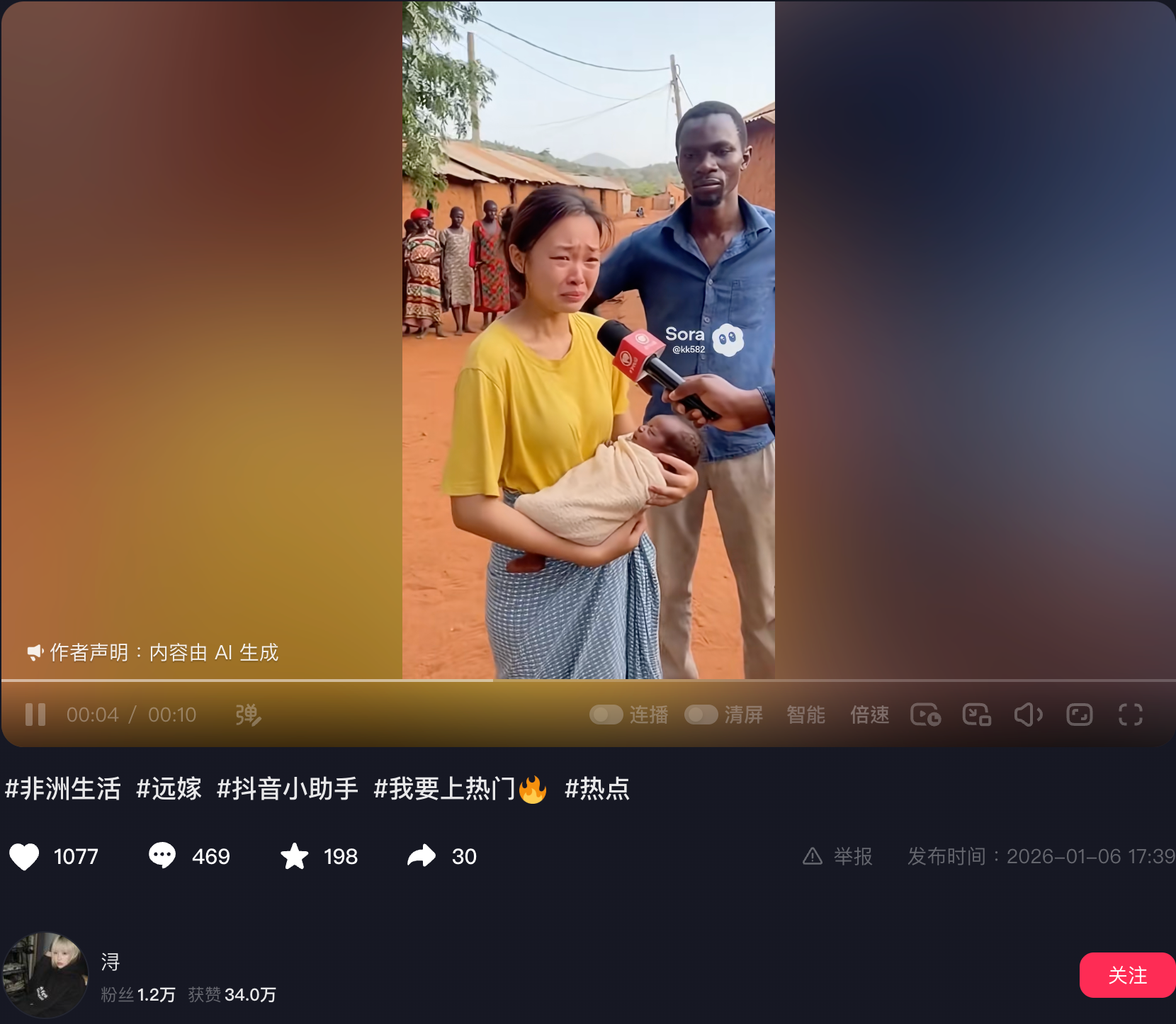 對比這兩條1月10日發佈的影片,可發現內容完全一致,而抖音影片發佈時間為1月10日下午5點59分,早於Facebook影片的發佈時間(晚上10點02分)。「浔」在發佈影片時註明内容由AI生成(見圖10)。