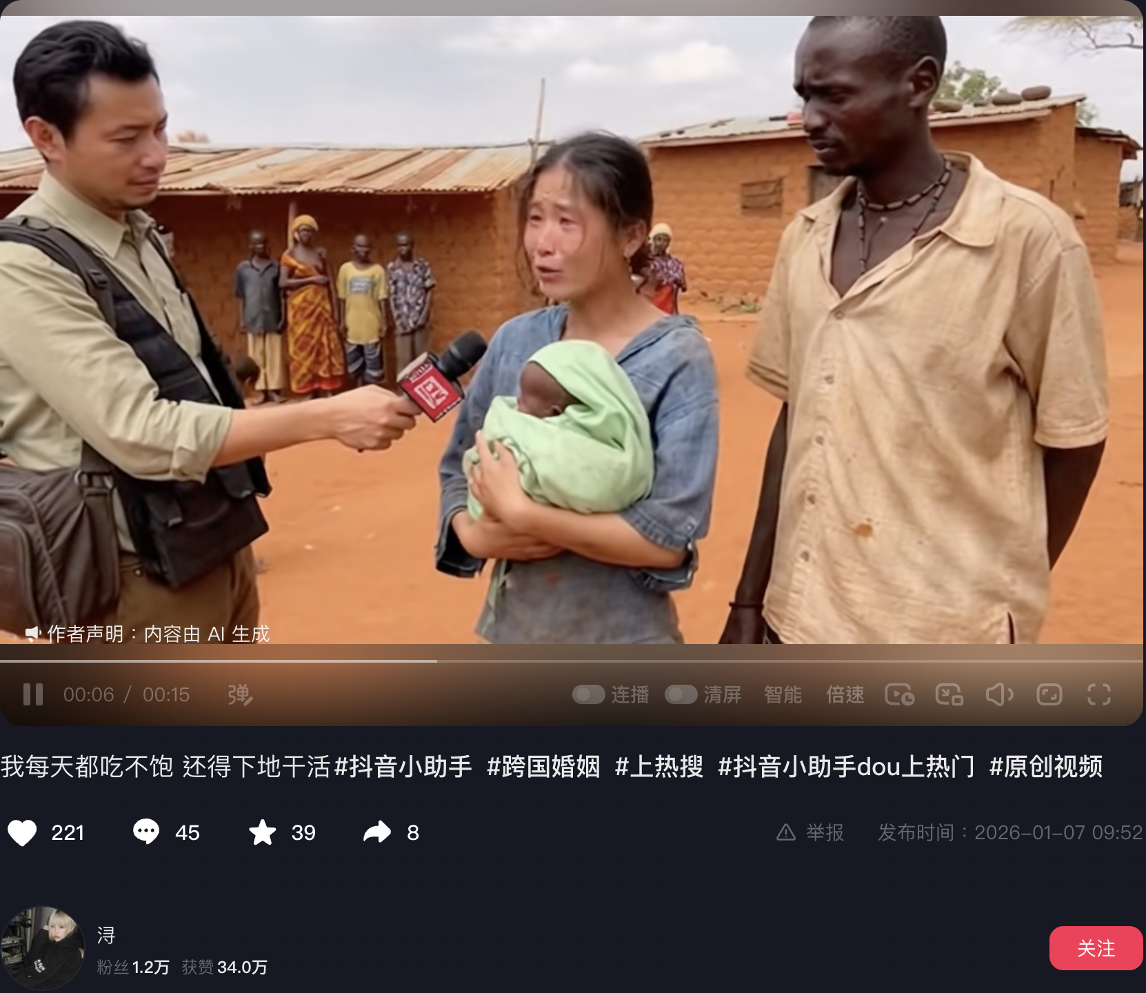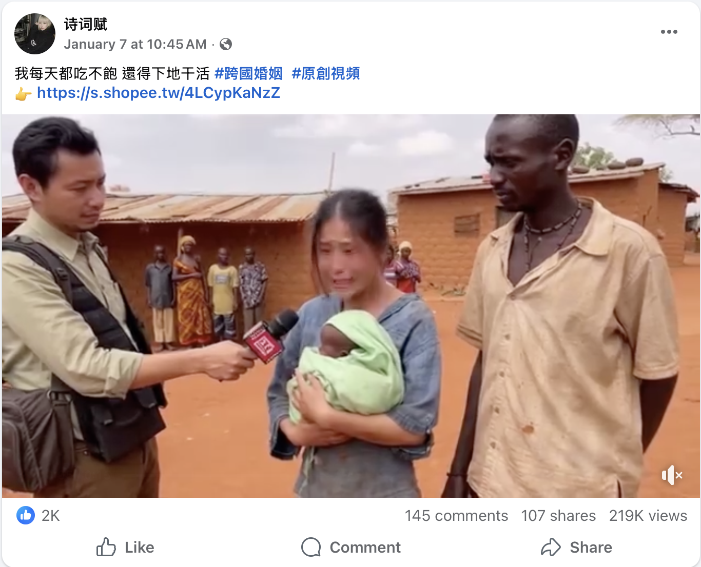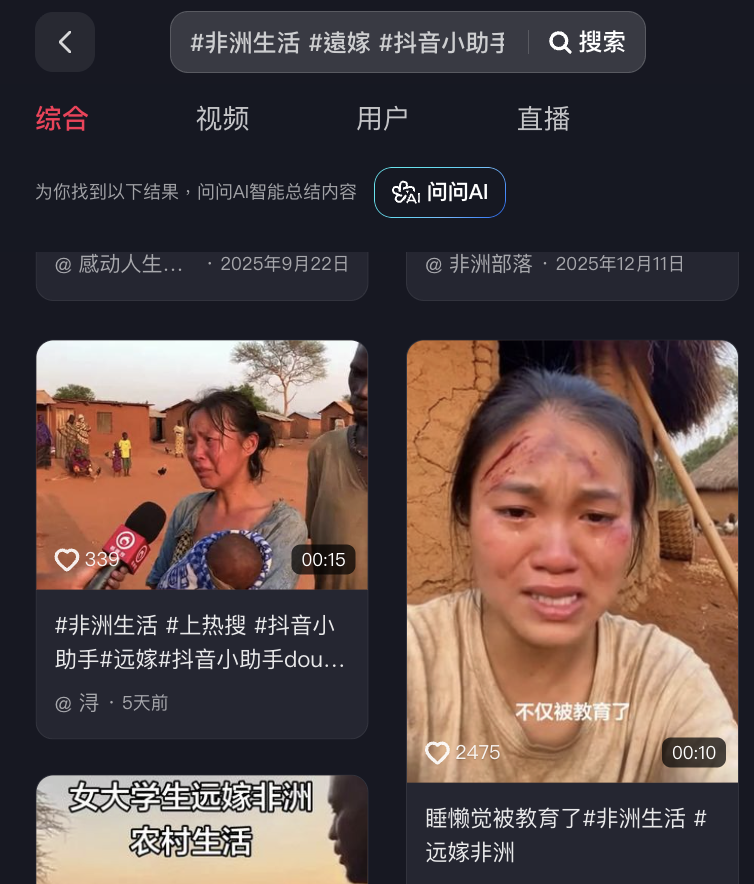 2026年1月6日,Facebook用戶「诗词赋」發佈一條影片。影片中一名東亞面孔、操普通話的女子抱著非裔面孔的嬰兒受訪,哭訴:「我每天早上天還沒亮就得下地幹活,寶寶還在懷裏餓得哭。」隨後女子身後一名非裔面孔的男子用普通話說:「我吃不飽飯都要分⋯⋯」影片獲得約3,900個讚好、329個留言、214次轉發分享以及約48.1萬次觀看。[1]