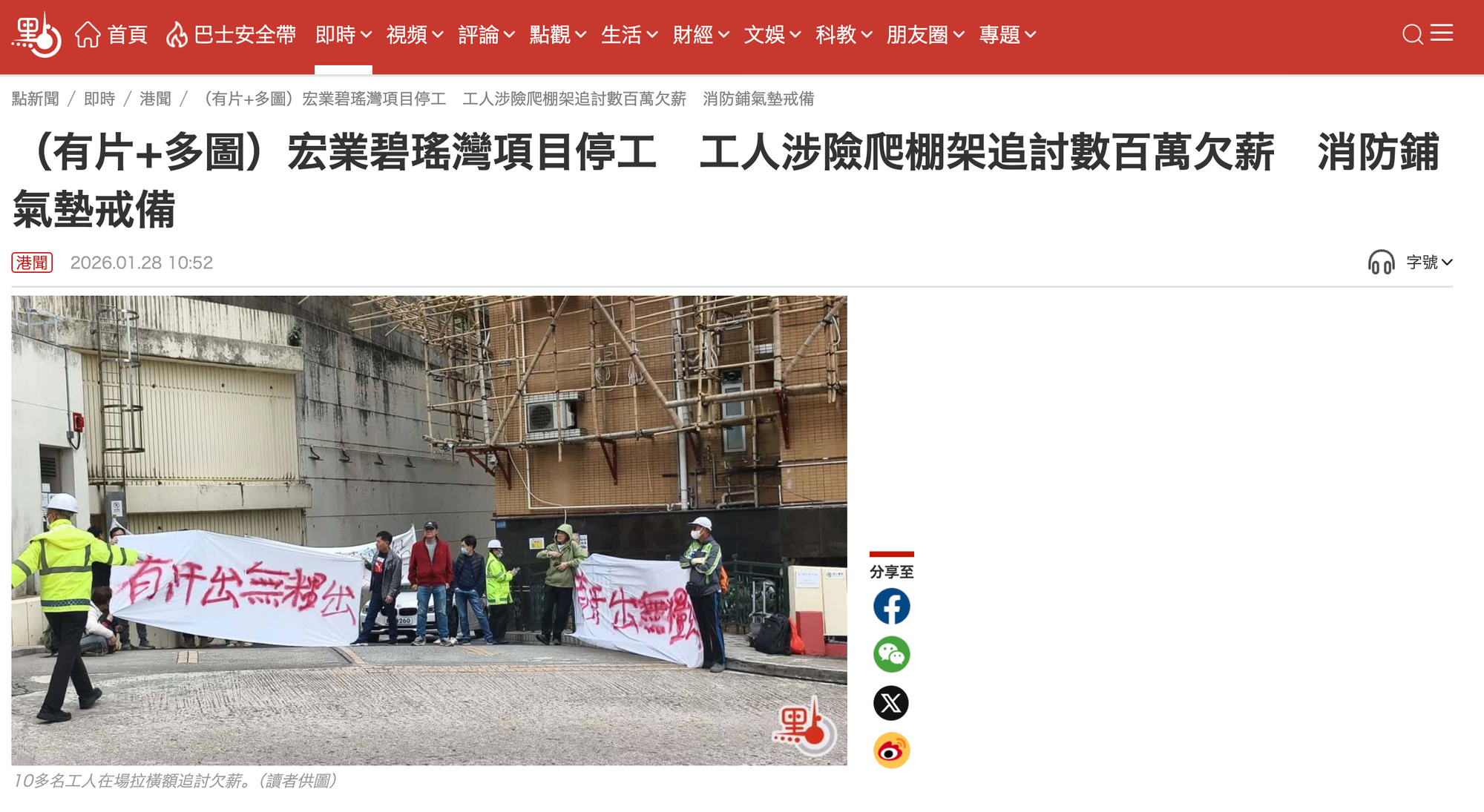 《點新聞》標註圖片為讀者供稿,《am730》則標註圖片出自「香港建造業總工會」Facebook專頁。翻查「香港建造業總工會」Facebook專頁,可找到2026年1月28日日上午發佈的帖文,其中第一張配圖即為《am730》所引用圖片,圖片中橫額上的文字同樣為「有汗出無糧出」。[6]