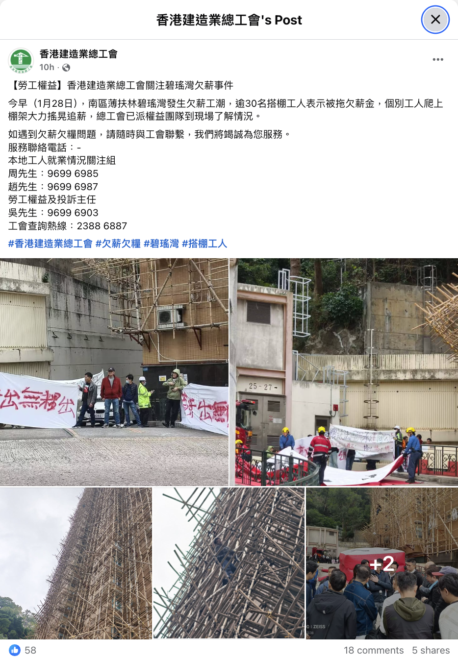 2026年1月28日上午,有工人到港島南區的碧瑤灣25至27座對開,拉橫額追討欠薪。另有兩名工人攀上大廈外牆棚架危坐,隨後被到場的警方及消防勸說回安全位置。在場工人控訴自去年9月份被欠薪至今,數十工友受到影響,涉款合共數百萬元。[1]碧瑤灣與早前發生火災的大埔宏福苑同由「宏業建築工程」承辦大維修。而自宏福苑發生五級大火後,該公司因相關「獲授權簽署人」(AS)辭任,不能再以註冊承建商身份進行《建築物條例》下的建築工程,多個承辦項目停工。[2]