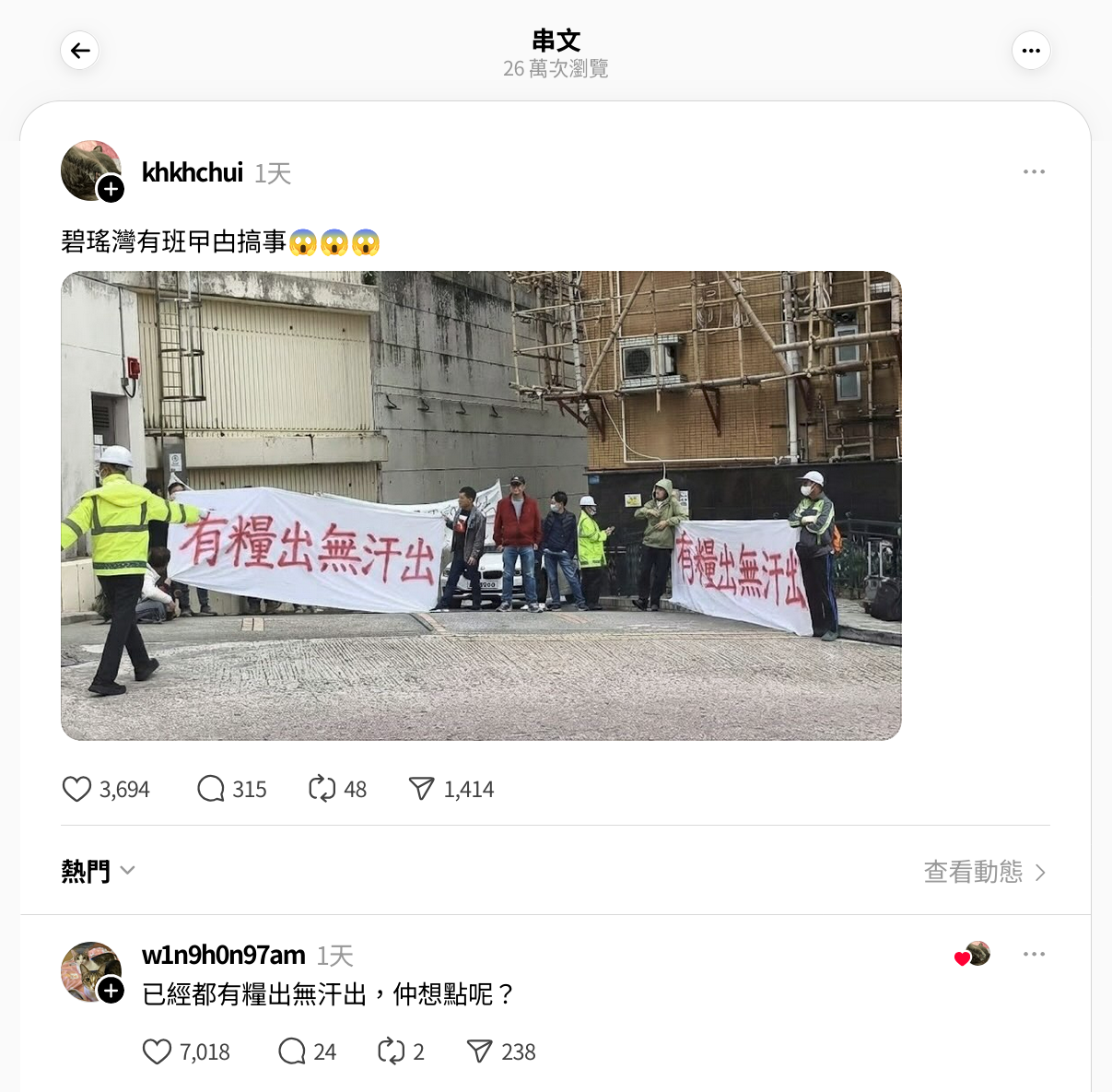 同日,Threads用戶「khkhchui」發佈帖文「碧瑤灣有班曱甴搞事😱😱😱」並貼出一張圖片。圖片中多名工人拉起兩個橫額,橫額上文字為「有糧出無汗出」。該用戶另讚好用戶「w1n9h0n97am」的留言「已經都有糧出無汗出,仲想點呢?」。帖文獲得3,694個表情反應、315個留言、1462次轉發以及約26萬次瀏覽。[3]