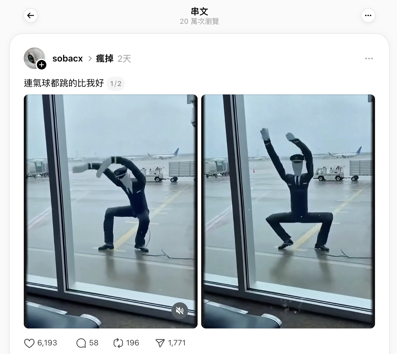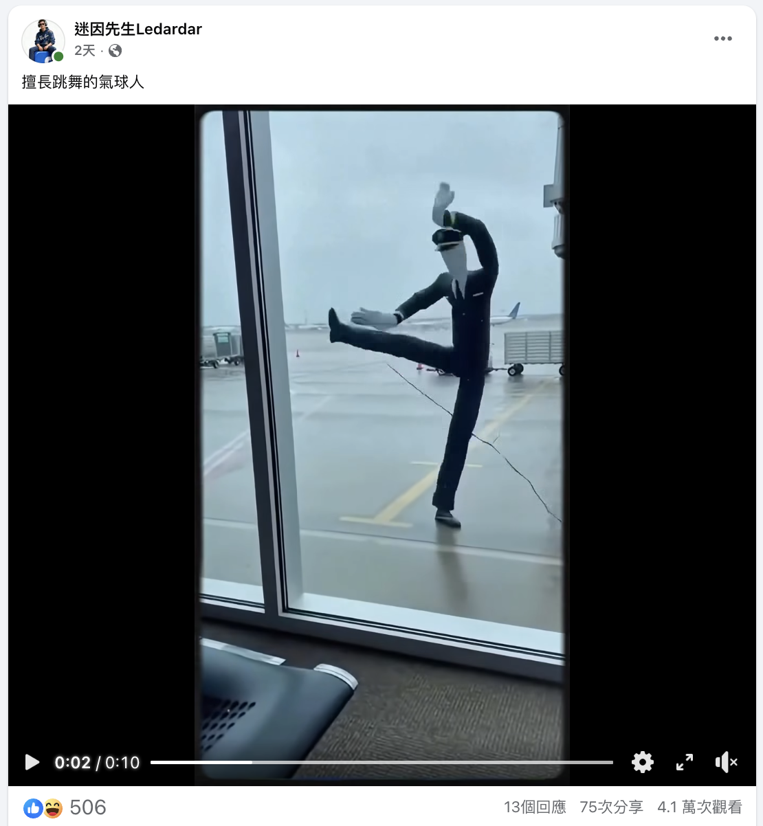 2026年1月14日,Facebook專頁「迷因先生Ledardar」發佈一段穿著機組人員制服的氣球人在機場跳舞的影片,表示「擅長跳舞的氣球人」。影片獲506個表情反應、13個回應、75次分享及超過4.1萬次觀看。[1]