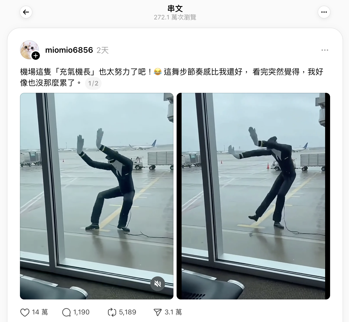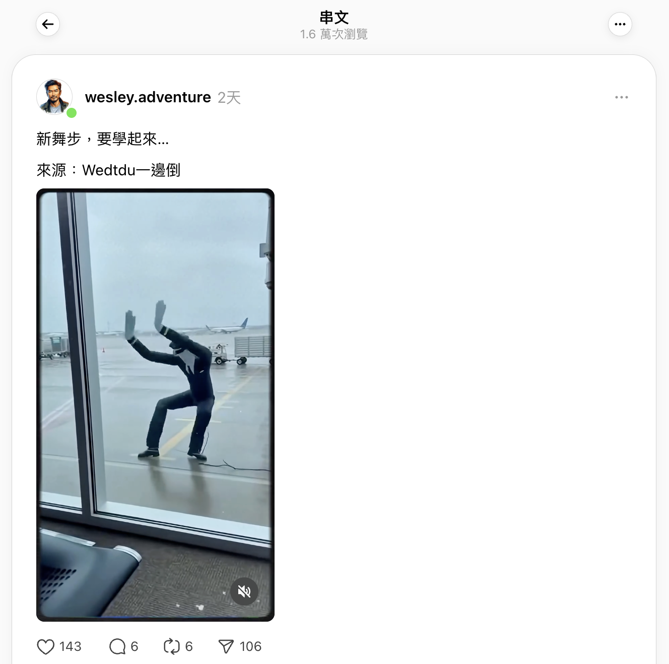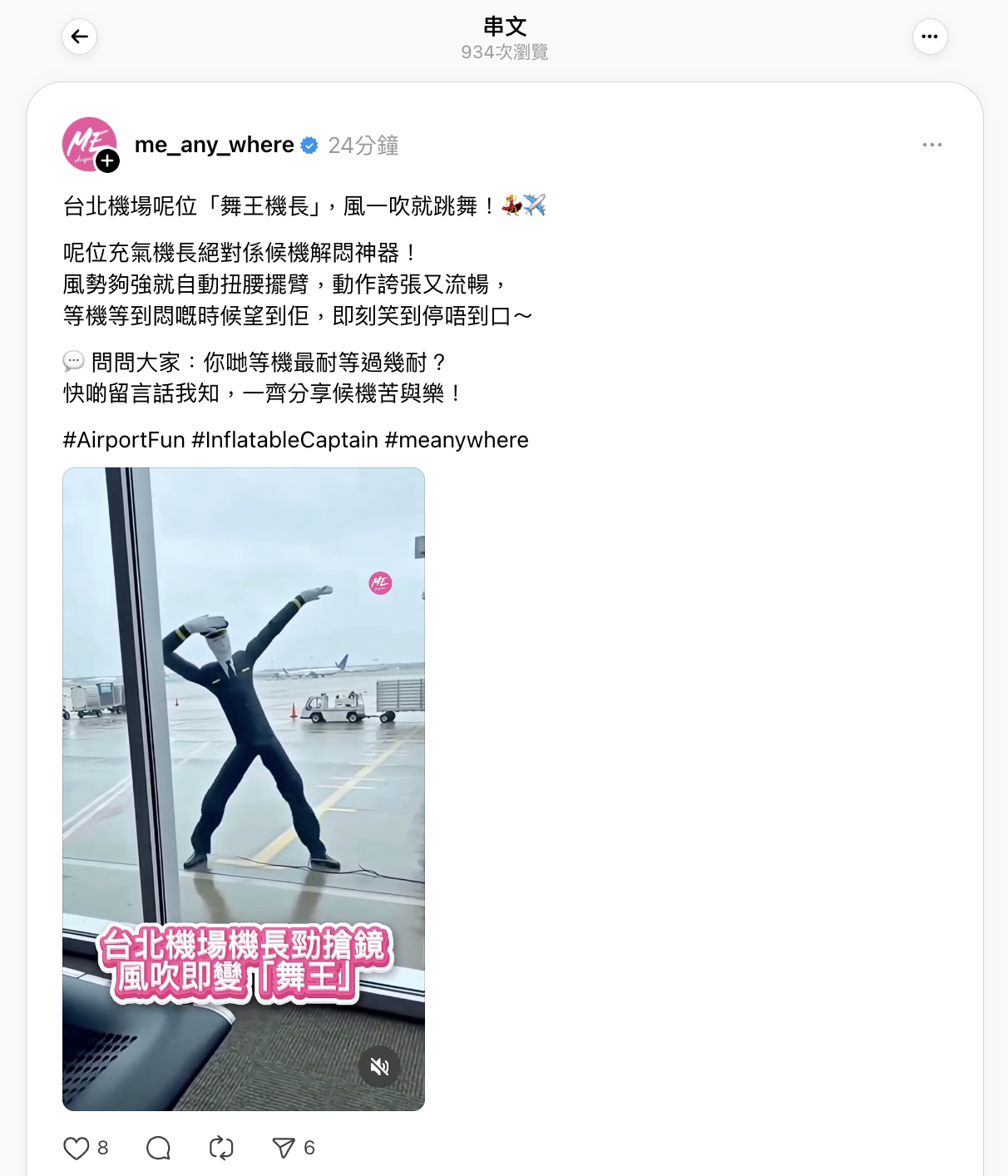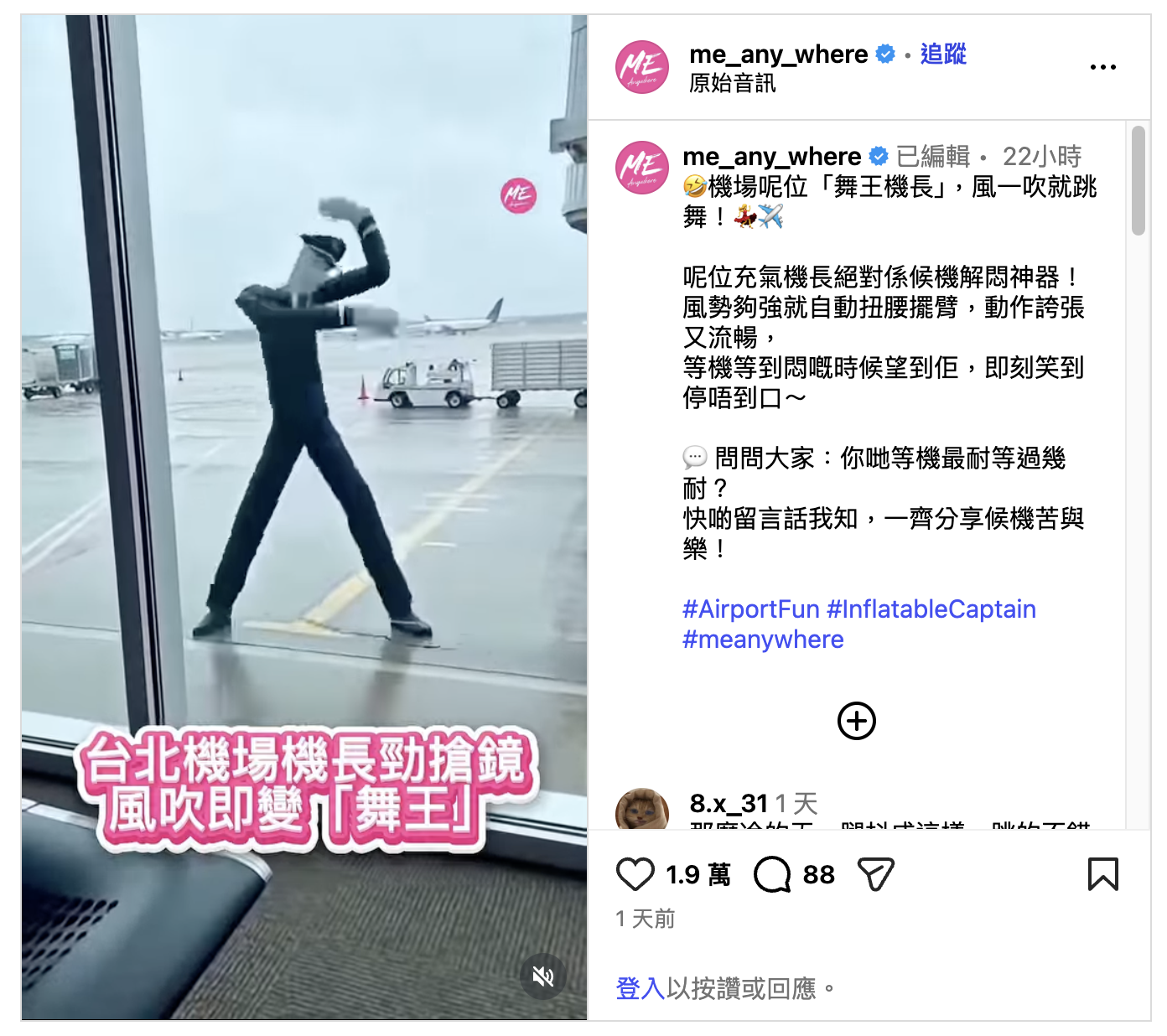 「Me-Anywhere.com」的Instagram和Threads於2026年1月17日發佈相同場景影片,聲稱片段攝於台北機場。[5,6]Instagram帖文獲逾1.8萬個讚好、88個回應及超過1.1萬次分享。