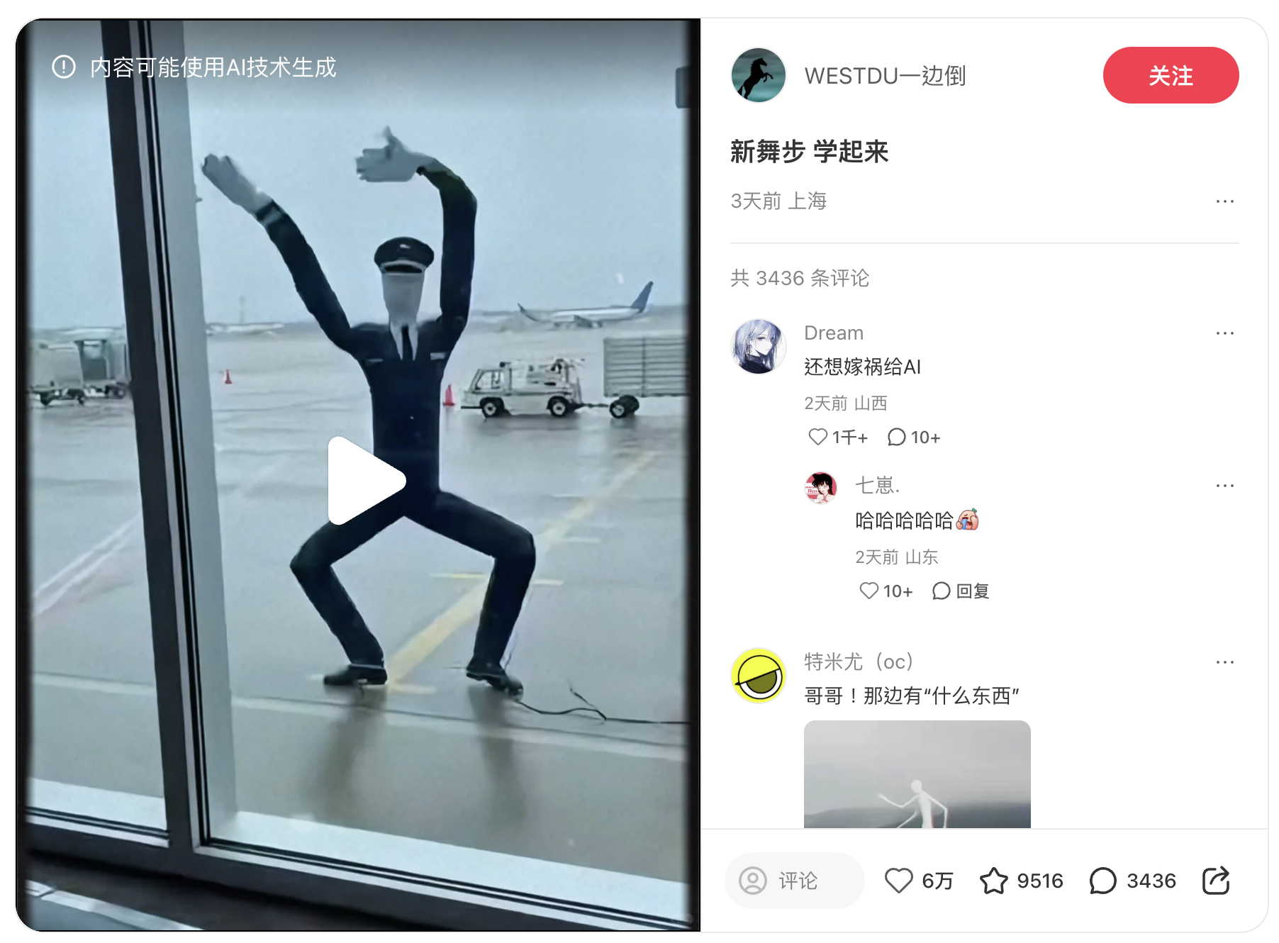 上述帖文中,Threads用戶「衛斯理的奇聞異事錄」提及片段源自「Wedtdu一邊倒」,但搜索並未發現同名社交媒體用戶,僅發現名為「WESTDU一边倒」的小紅書用戶於2026年1月14日發佈的相同片段,惟該片段被小紅書標註「內容可能使用AI技術生成」。[7]此外,Facebook專頁「迷因先生Ledardar」主頁簡介自稱為「AI視覺藝術家」及「專注將AI創作故事影像化」。[8]