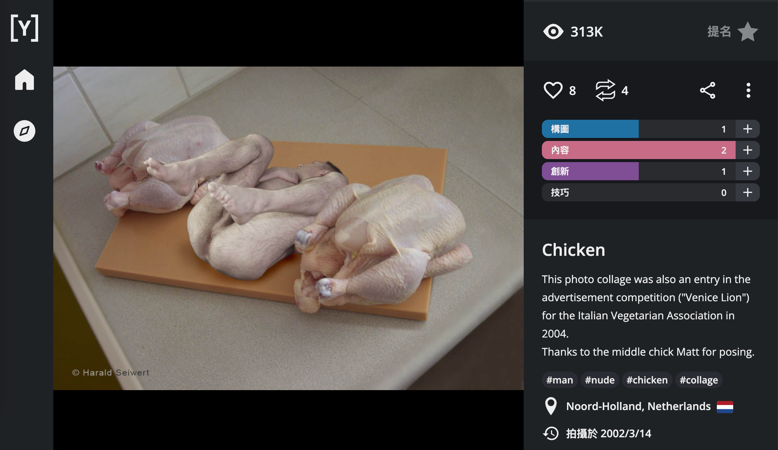 在Google以關鍵詞「Harald Seiwert chicken」搜尋,可發現圖片分享網站YouPic的用戶「harald.seiwert」發佈於11年前的圖片,其中並無網傳圖片中的黑色方塊。簡介顯示,該圖片為一張名為「雞肉」(Chicken)的照片拼貼,中間是一位模仿雞隻姿勢的模特兒,該作品曾參加了2004年意大利素食協會(Italian Vegetarian Association)舉辦的廣告比賽。[15]根據其簡介,該用戶為荷蘭的平面設計師及藝術家。[16]
