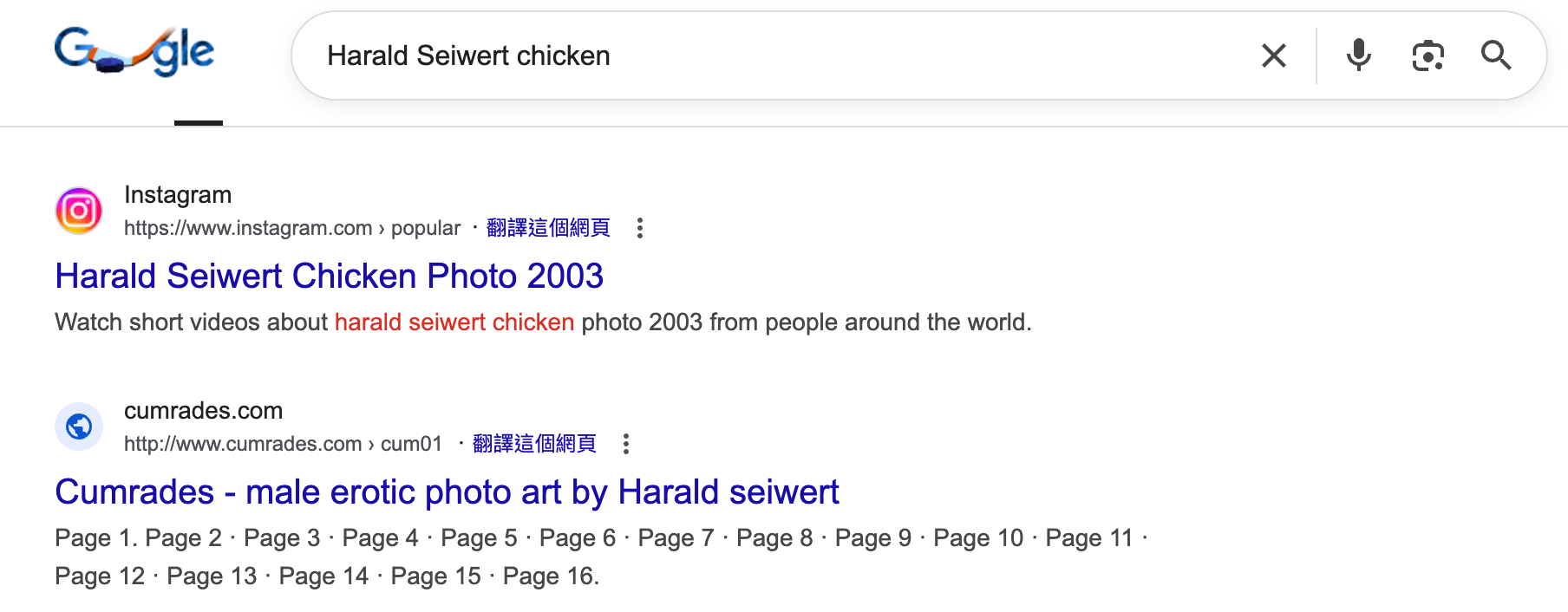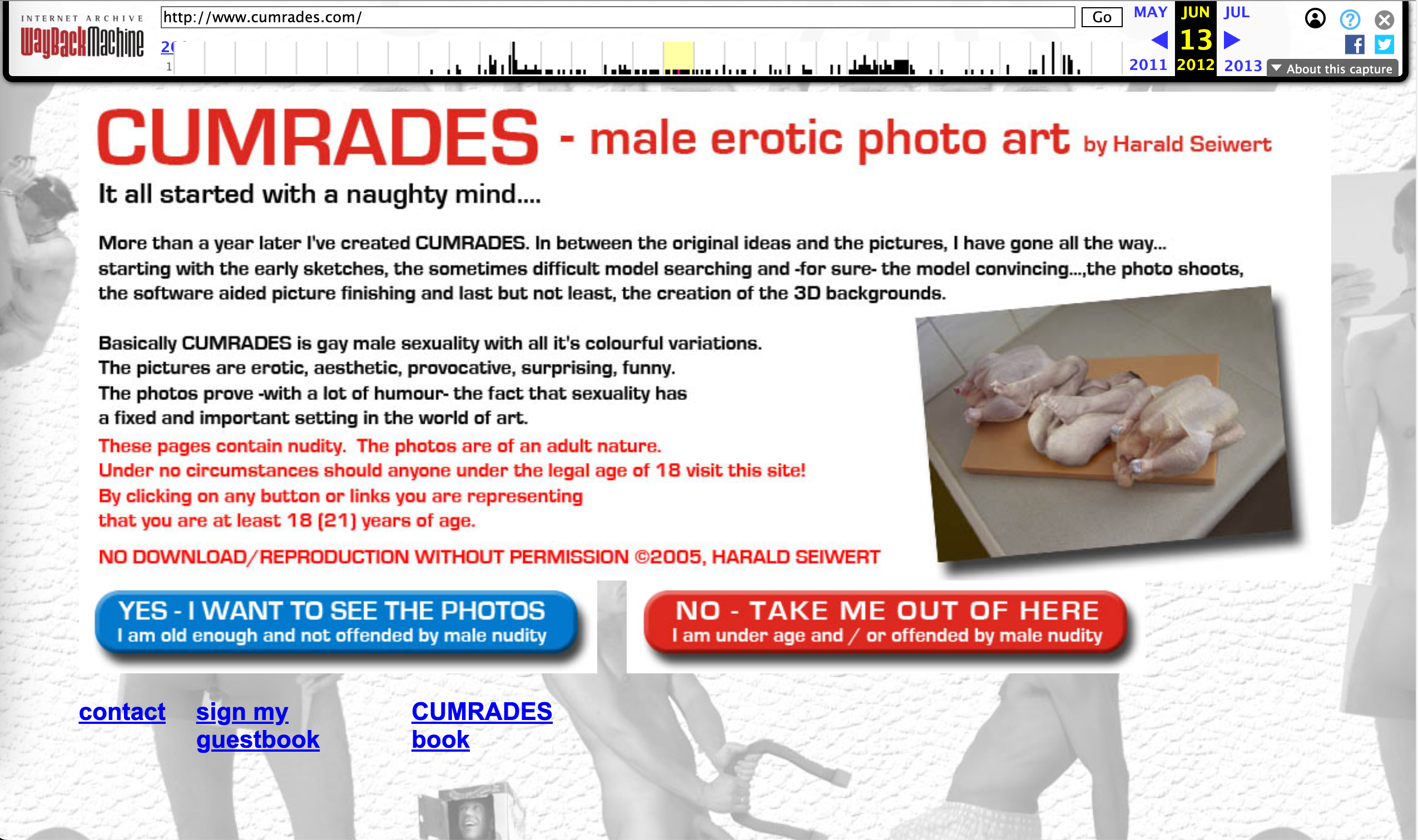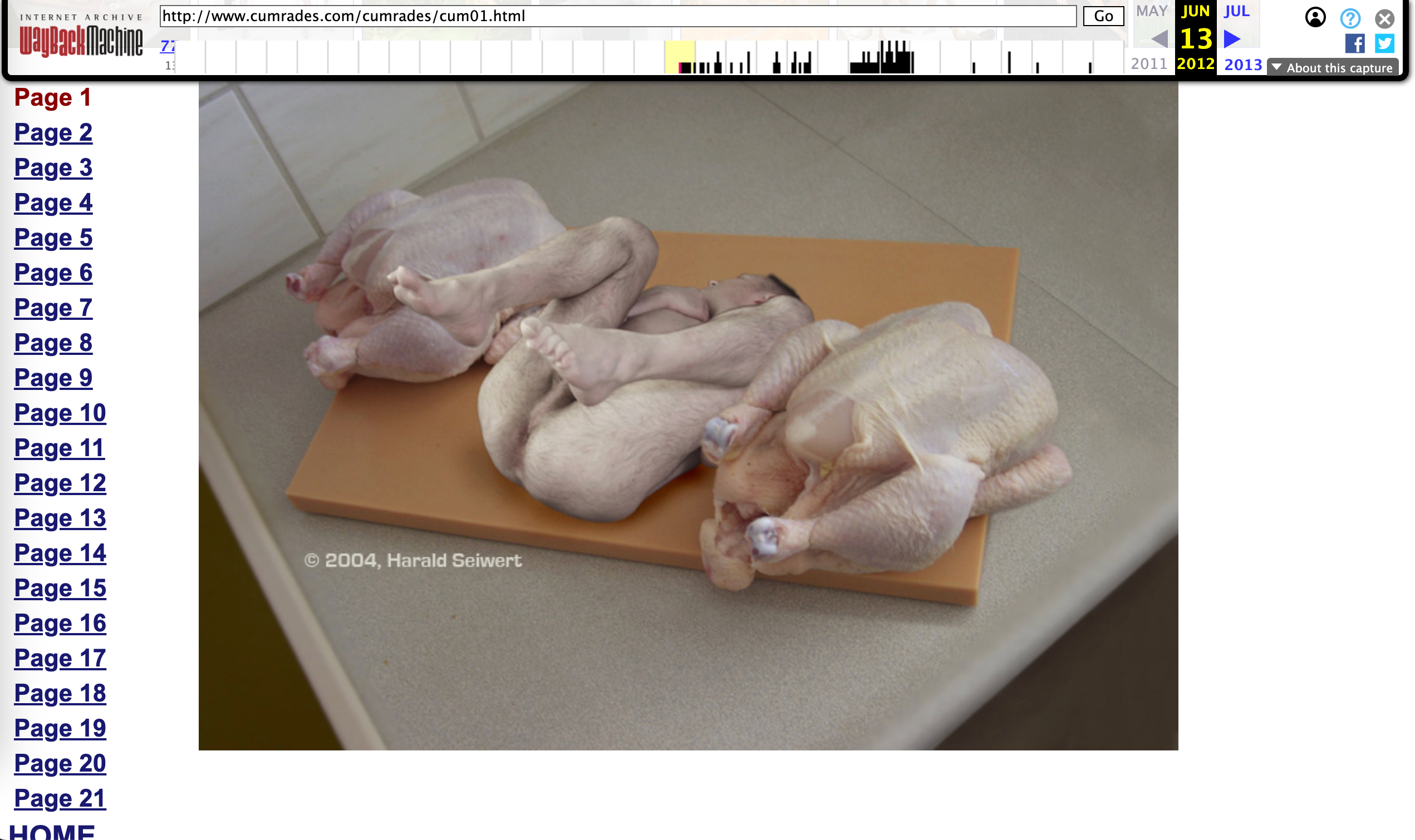 Google搜尋結果中的第4頁可發現Harald Seiwert藝術項目「Cumrades」的網站,使用Wayback Machine可檢視該網站2012年的版本。簡介顯示,「Cumrades」是一組有關男同性戀者的裸體藝術作品,通過篩選模特、拍攝照片再進行後期處理而製成。[17,18]點擊年滿18歲的同意按鈕後可瀏覽該項目的所有作品,第一頁即為網傳的雞肉圖片,未有加上黑色方塊,同樣有水印顯示Harald Seiwert的名字,惟位置及年份有別。[19]