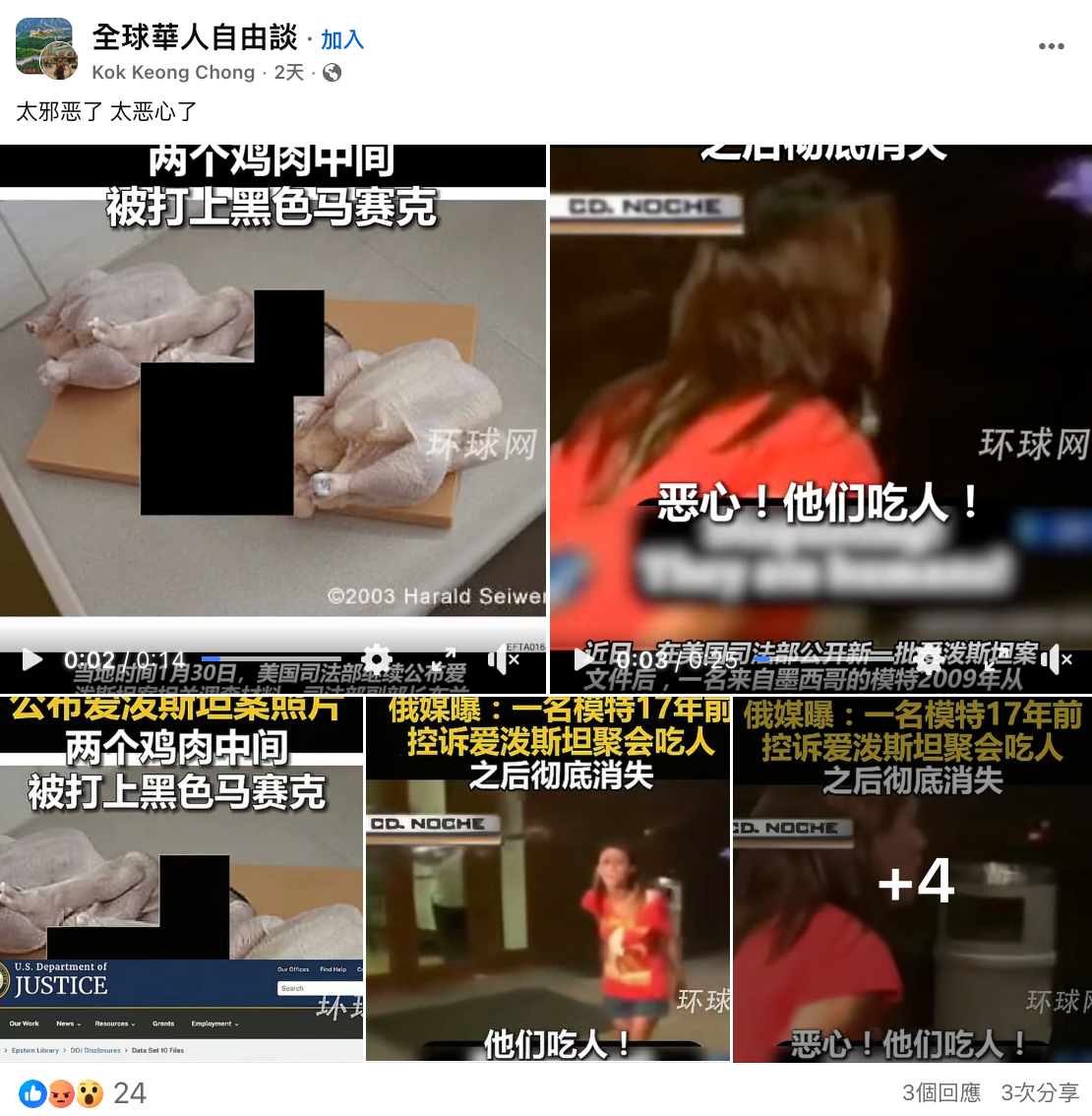 2026年2月1日,Facebook專頁「香港商報」發佈一段影片,其中顯示一張被黑色 方塊遮蓋的照片,方塊旁物體疑似人類腿部,左右兩邊為雞肉。「香港商報」稱此為美國司法部公佈艾普斯坦案文件中編號為「EFTA01646032」的照片,並指訊息源自「環球網援引外媒報道」。有用戶留言「吃人肉;變態的政客」及「……吃人肉的世界嗎!!??」等,認為片段顯示吃人場景。[3]