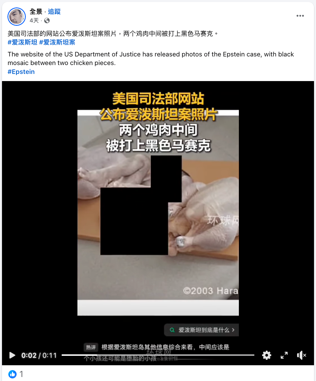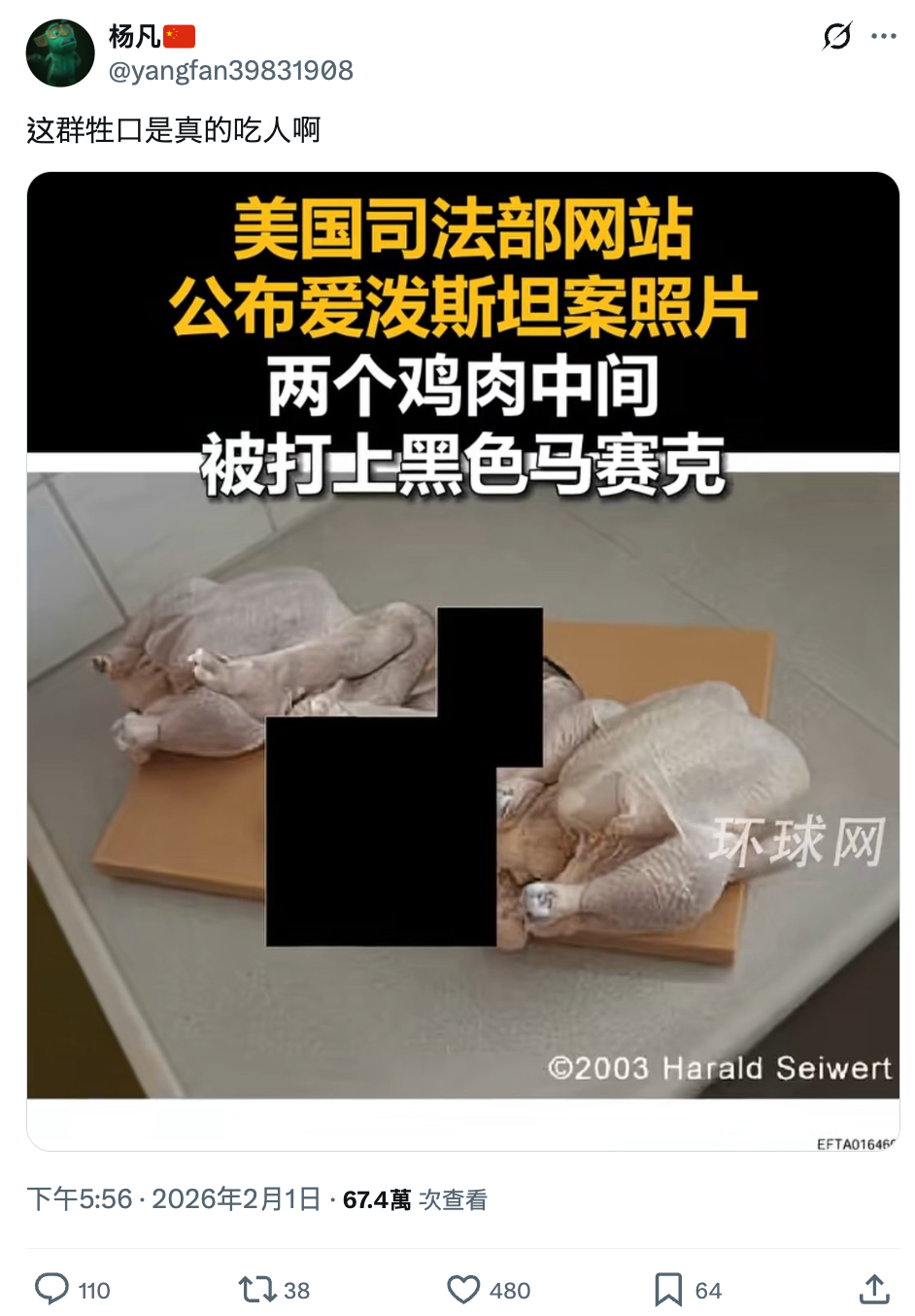 2026年2月,網絡流傳一張據稱來自美國政府公佈的艾普斯坦案文件的圖片,圖片中間被黑色方塊遮蓋,左右兩邊為雞肉。有帖文指黑色方塊附近物體疑似為人腿,相關帖文下有用戶質疑為吃人肉的場景。