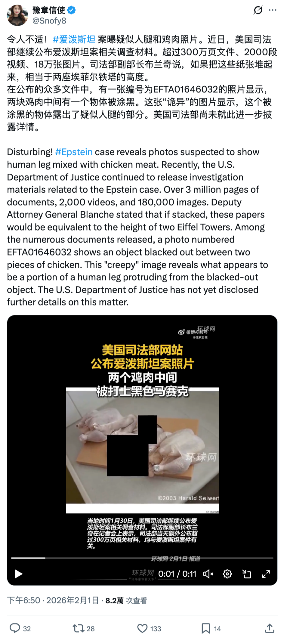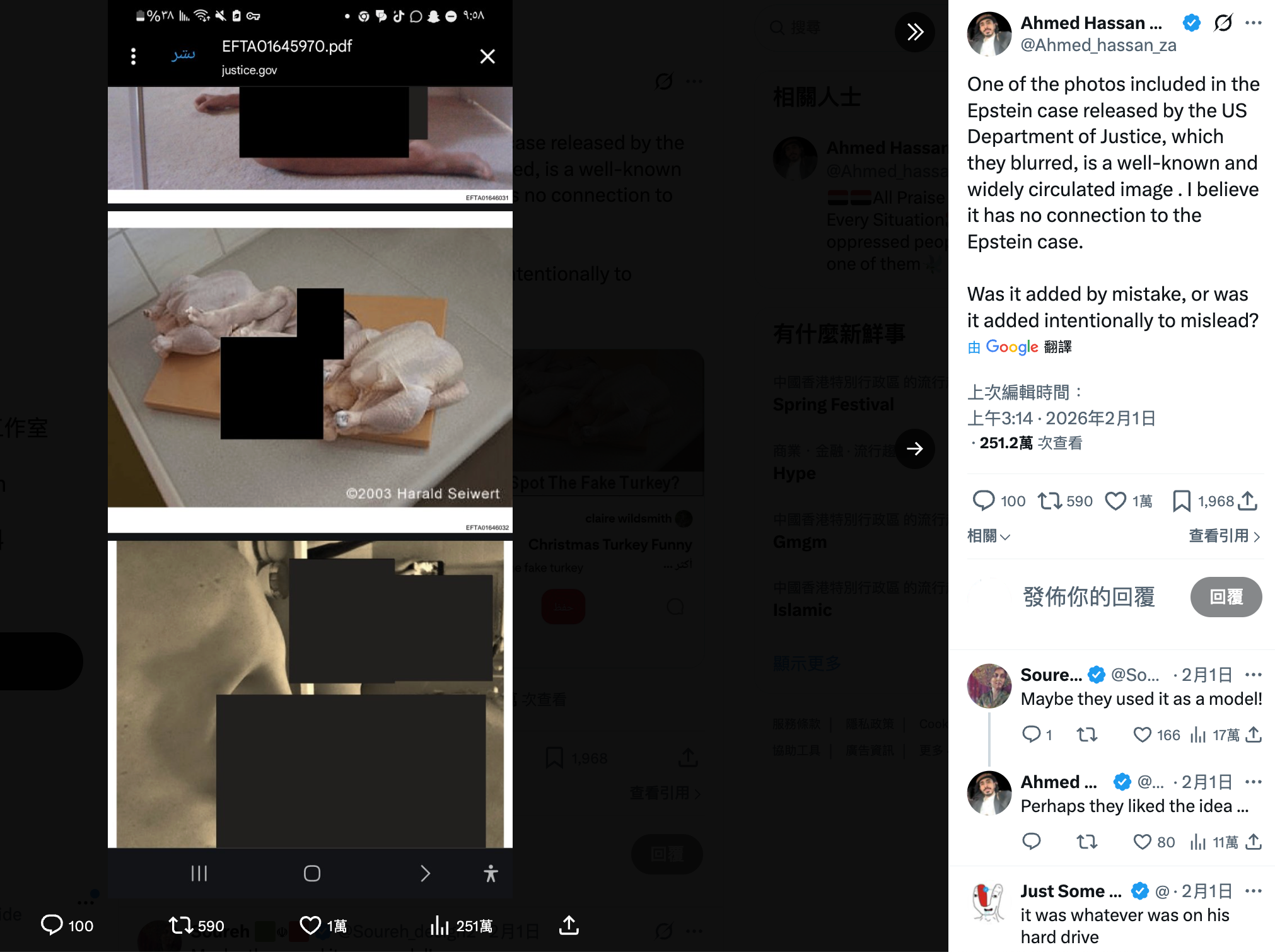 使用Google逆向搜尋網傳片段截圖,可發現X用戶「Ahmed Hassan 🇾🇪 أحمد حسن زيد」於2026年2月1日發佈包含相同雞肉圖片的截圖,截圖上方顯示美國司法部網站「justice.gov」一份名為「EFTA01645970」的PDF文檔。[11]