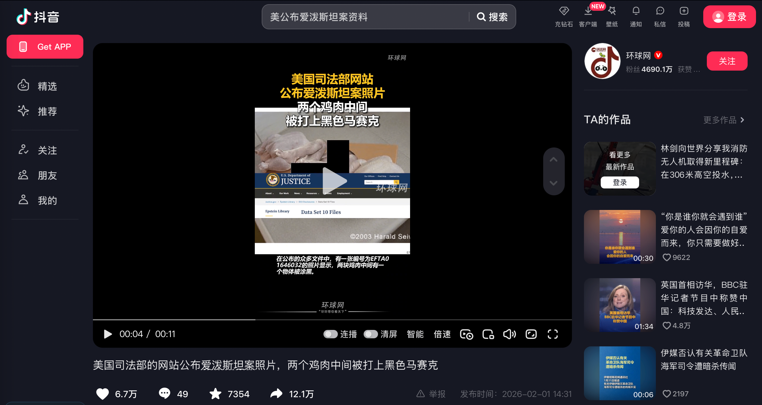 在抖音用戶「环球网」的過往內容中搜尋可發現發佈於2026年2月1日的相同影片,片中第4秒處顯示美國司法部網站中艾普斯坦檔案庫(Epstein Library)的「第十數據集文件」(Data Set 10 Files)的截圖頁面。[10]