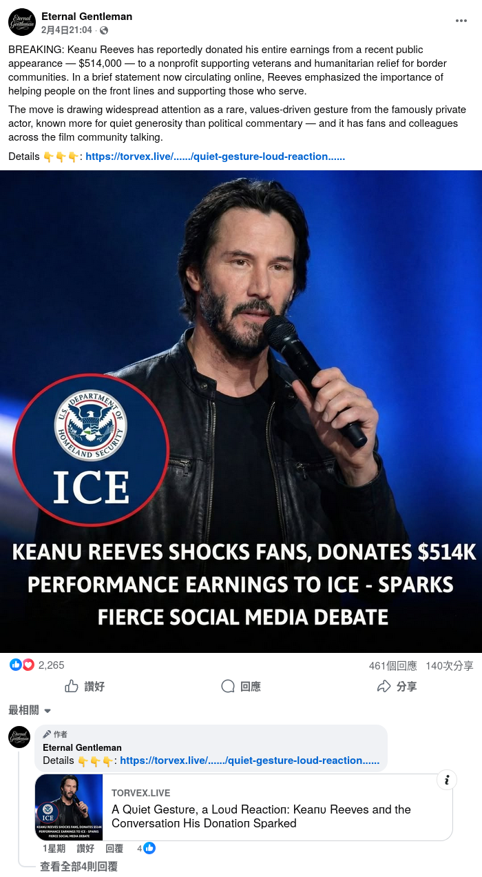- Facebook用戶「Patrick Yeh」帖文,archive.today備份網頁。圖中英語字句為 “Keanu Reeves shocks fans, donates $514K performance earnings to ICE - sparks fierce social media debate.”。