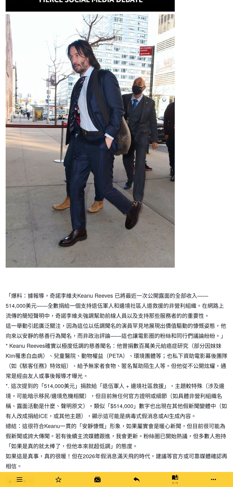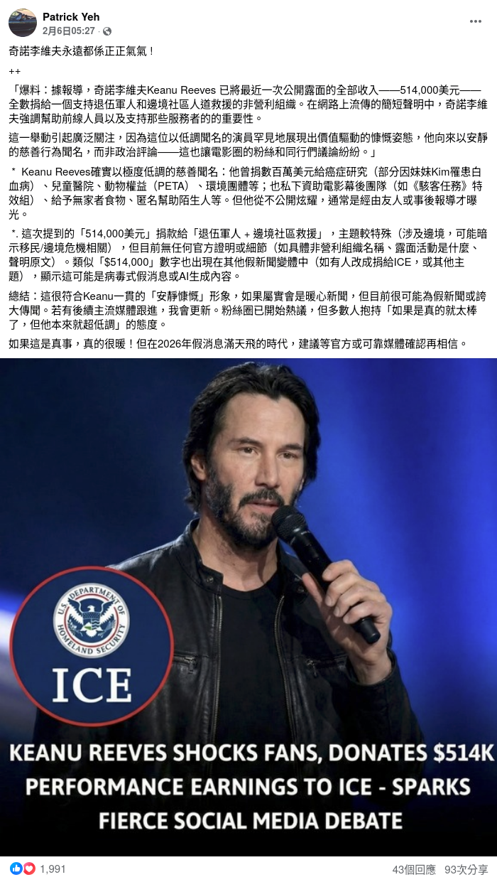 「Patrick Yeh」表示奇洛李維斯(帖文誤譯為「奇諾李維夫」)「永遠都係正正氣氣」,同時引述一段關於這則消息的分析。該段文字指有報導稱奇洛李維斯捐出51萬4千美元給一個「支持退伍軍人和邊境社區人道救援的非營利組織」,同時提到該說法「目前無任何官方證明或細節」、「很可能為假新聞或誇大傳聞」及「建議等官方或可靠媒體確認再相信」,又表示「若有後續主流媒體跟進,我會更新」。