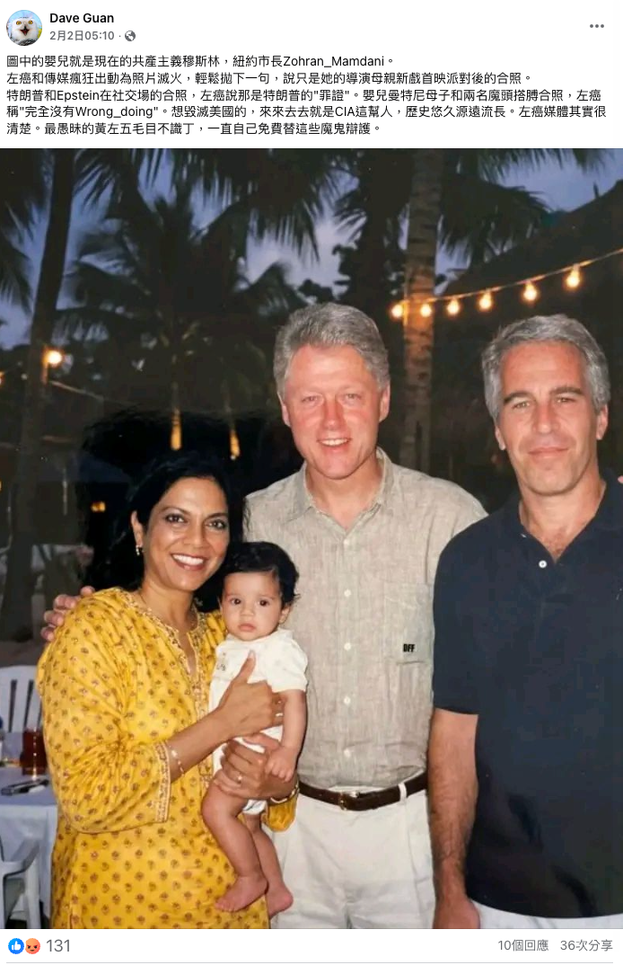 2026年2月2日,Facebook用戶「Dave Guan」發佈一張合照,圖中包括艾普斯坦、前美國總統克林頓(Bill Clinton)、一名身穿黃色長裙手抱嬰兒的女子。「Dave Guan」聲稱圖中的嬰兒及女子分別為為紐約市長曼達尼(Zohran Mamdani)及其母親。帖文獲得131個表情反應、10個留言及36次分享。[3]