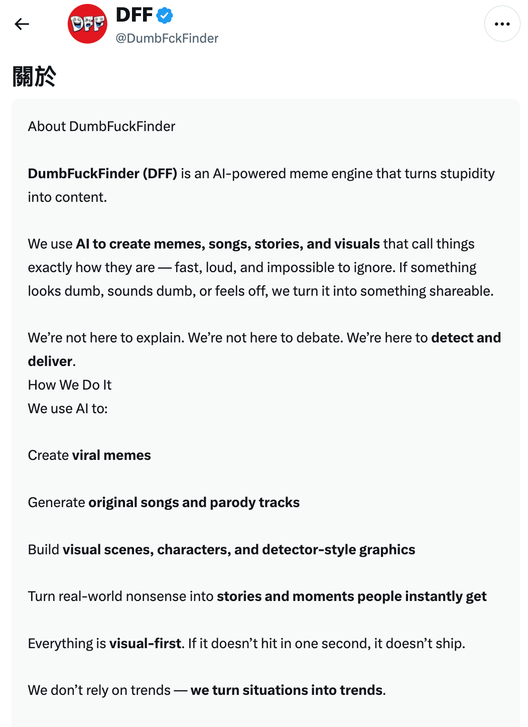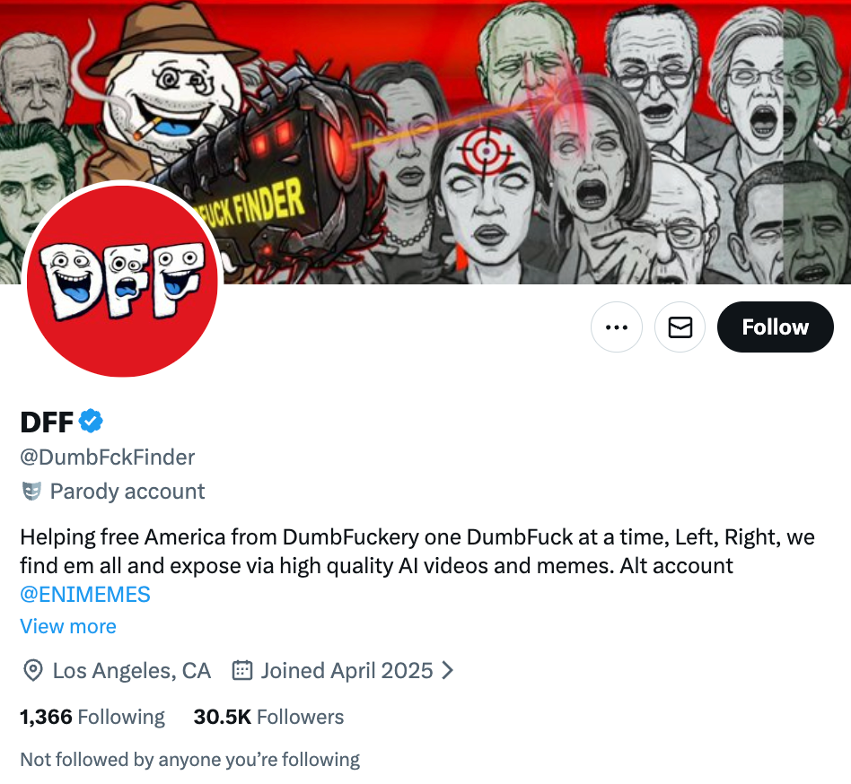 - X用戶「DFF」(@DumbFckFinder)主頁簡介,archive.today備份網頁。原文為“About DumbFuckFinder DumbFuckFinder (DFF) is an AI-powered meme engine that turns stupidity into content. We use AI to create memes, songs, stories, and visuals that call things exactly how they are — fast, loud, and impossible to ignore. If something looks dumb, sounds dumb, or feels off, we turn it into something shareable.”由於「DFF」亦修改個人簡介,現時簡介原文為“DFF=DumbF#ckFinder — Helping free America from DumbF*ckery, One DumbF*ck at a Time & Expose via AI Videos & Memes~ Click the Highlights Tab For Our Best Work!”,仍提及為發佈AI影片和迷因內容的帳號。