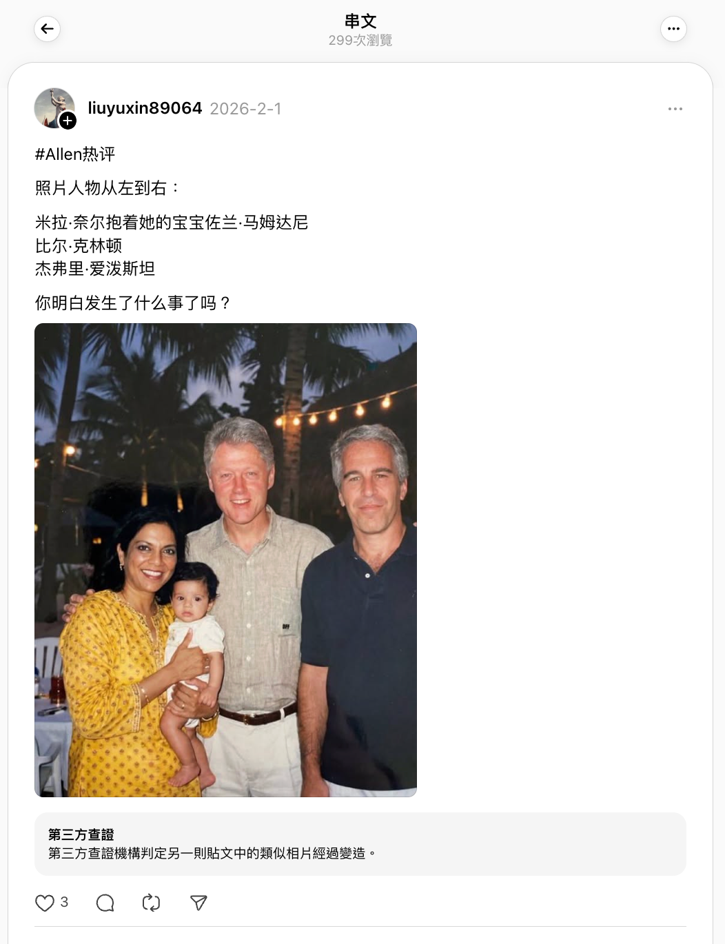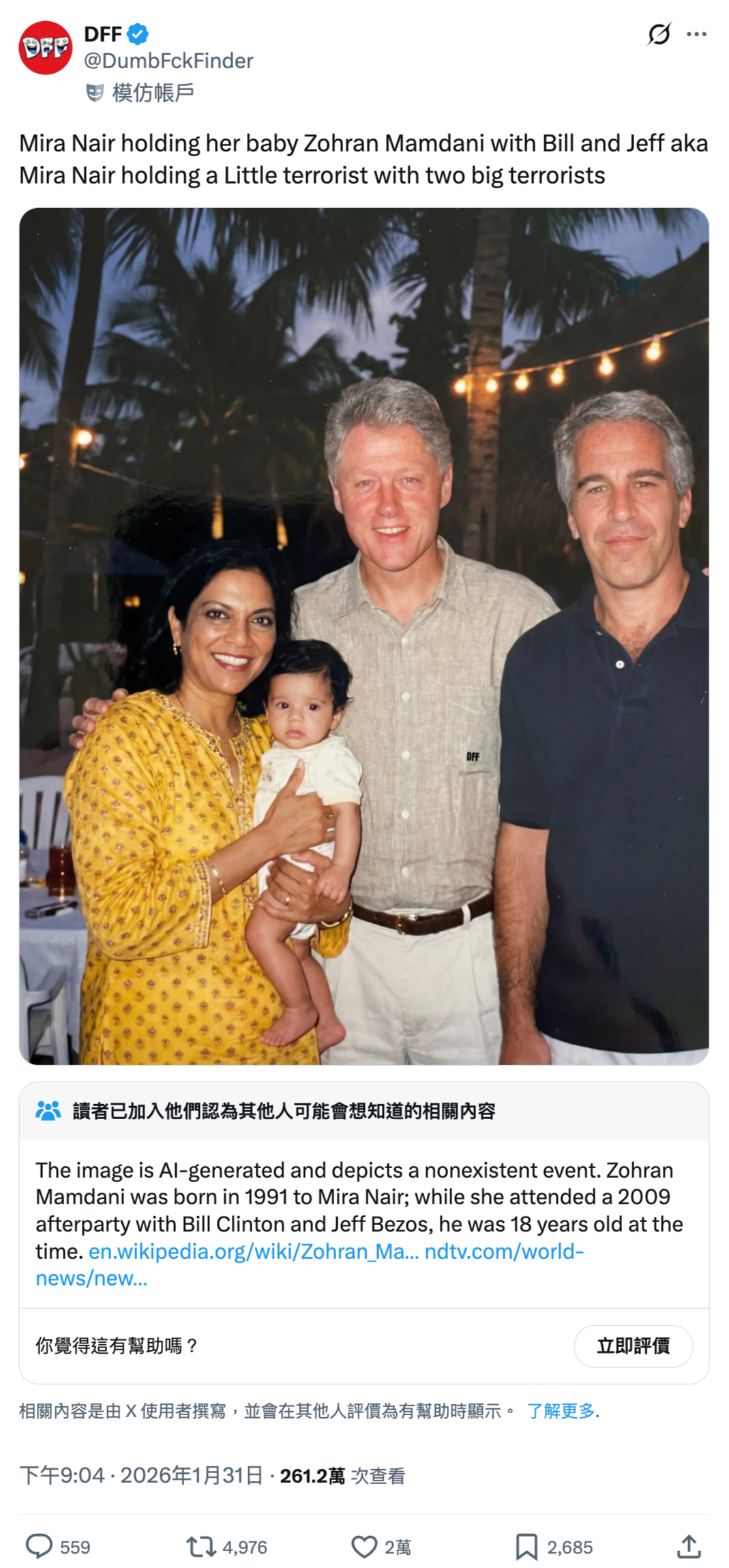 - X用戶「DFF」(@DumbFckFinder)2026年1月31日帖文,archive.today備份網頁。原文為“Mira Nair holding her baby Zohran Mamdani with Bill and Jeff aka Mira Nair holding a Little terrorist with two big terrorists”