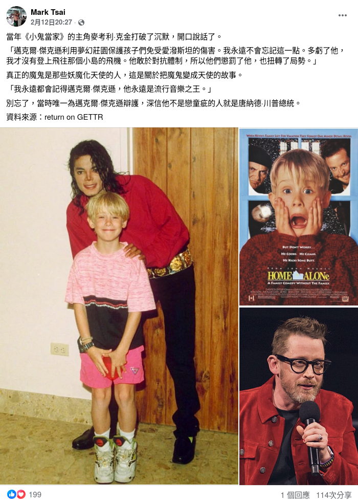 同日Facebook用戶「Mark Tsai」發佈帖文,附圖與「朱世郎」帖文相同,內容亦相似,僅多出一句「我永遠都會記得邁克爾·傑克遜,他永遠是流行音樂之王」。帖文獲得199個表情反應、1個留言及114次分享。[3]