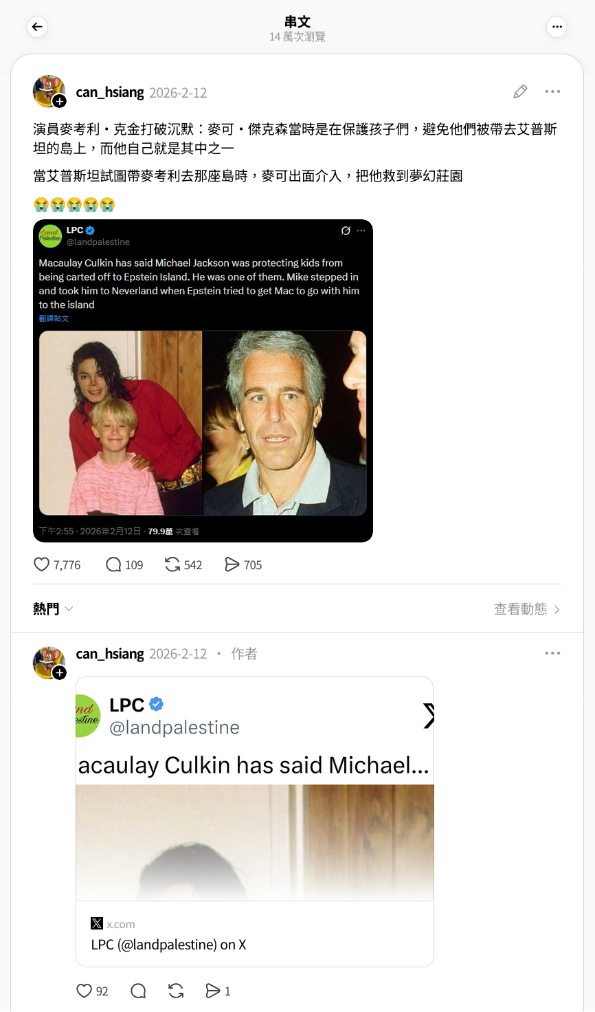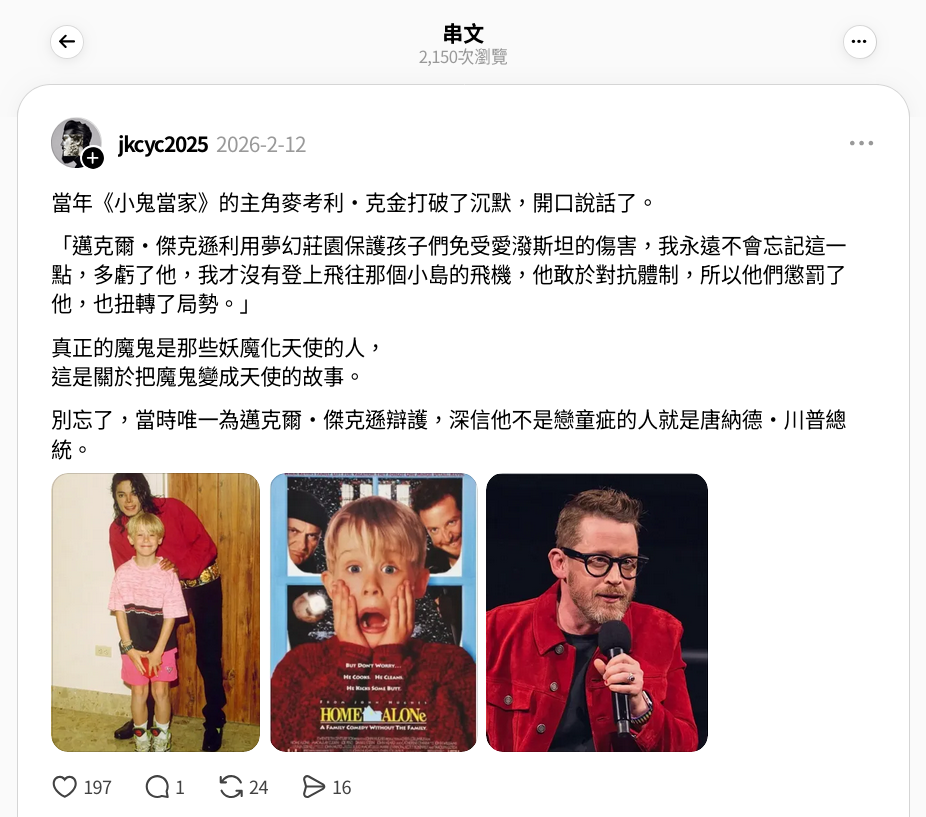 2026年2月12日,Threads用戶「can_hsiang」發佈帖文,宣稱電影《寶貝智多星》(Home Alone,帖文使用台譯《小鬼當家》)演員麥哥里·高堅(Macaulay Culkin,帖文譯作麥考利·克金)打破沉默,表示已故歌星米高·積遜(Michael Jackson,帖文譯作邁克爾·傑克遜)保護孩子避免他們被帶去艾普斯坦(Jeffrey Epstein,帖文譯作愛潑斯坦)的島上,而他是其中一人。帖文附上一張X(前稱Twitter)英語帖文截圖,並於留言貼出該帖文連結。帖文獲得7,776個讚好、109個留言、1,247個分享及逾14萬次瀏覽。[1]