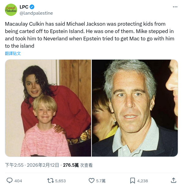 2026年2月,網上流傳帖文宣稱電影《寶貝智多星》(Home Alone)演員麥哥里·高堅(Macaulay Culkin)發聲,表示已故歌星米高·積遜(Michael Jackson)曾阻止他登機前往艾普斯坦(Jeffrey Epstein)的小島。有帖文顯示說法來自一則X帖文,惟沒有進一步提供出處。