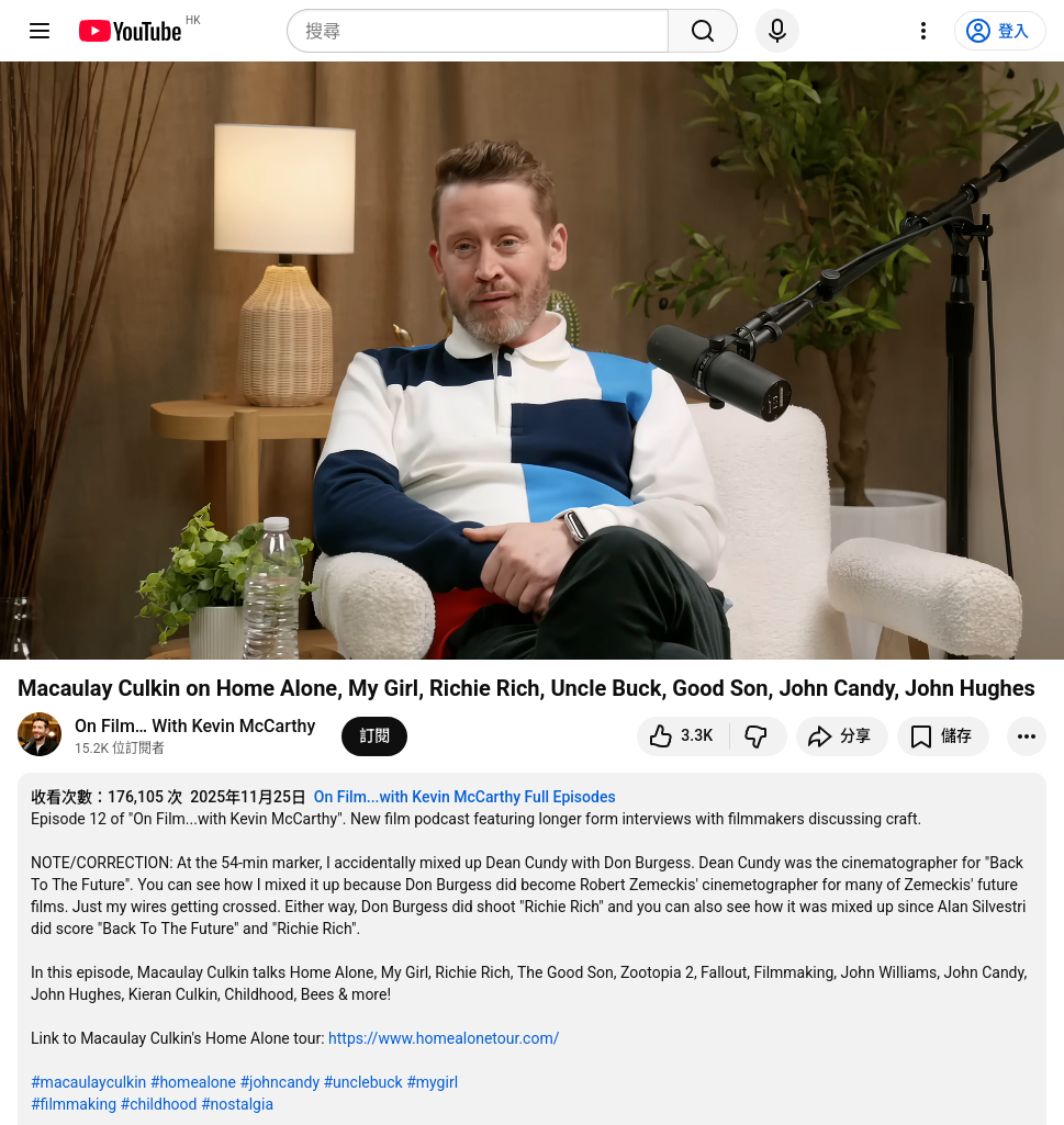 - Macaulay Culkin on Home Alone, My Girl, Richie Rich, Uncle Buck, Good Son, John Candy, John Hughes (YouTube / On Film… With Kevin McCarthy)