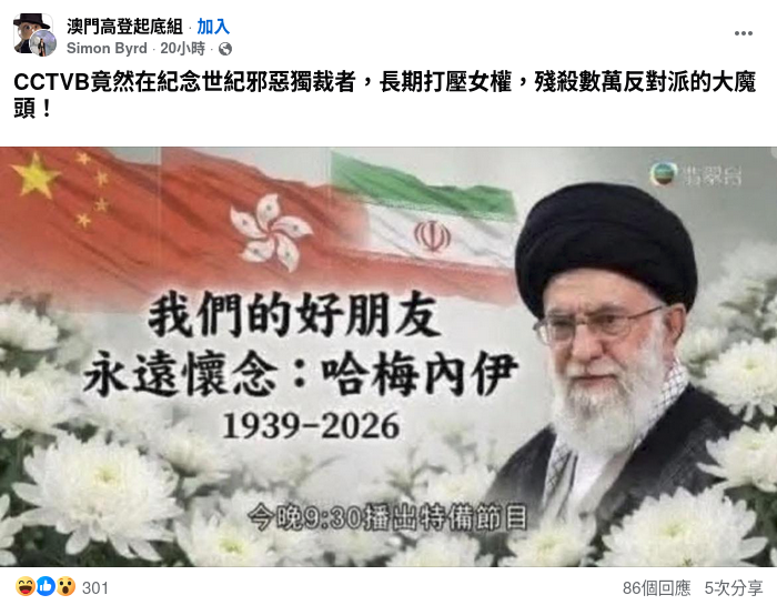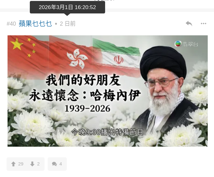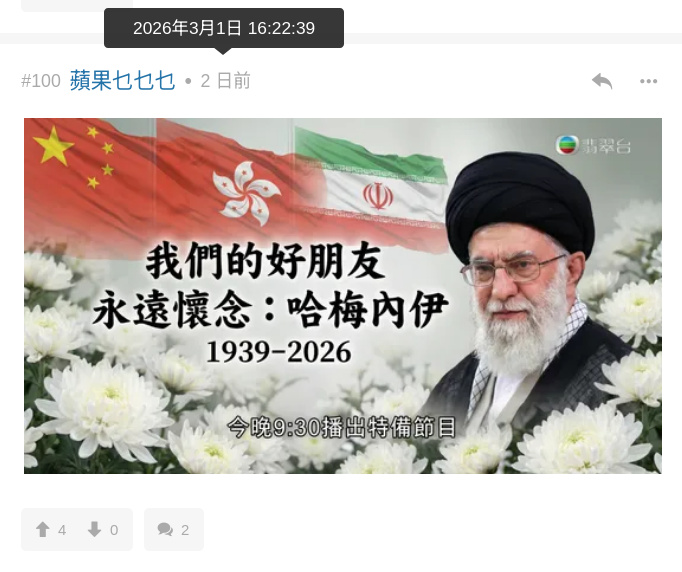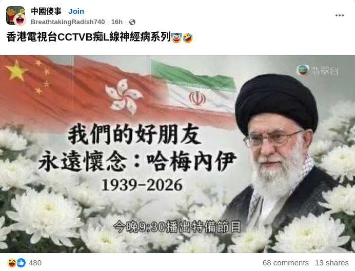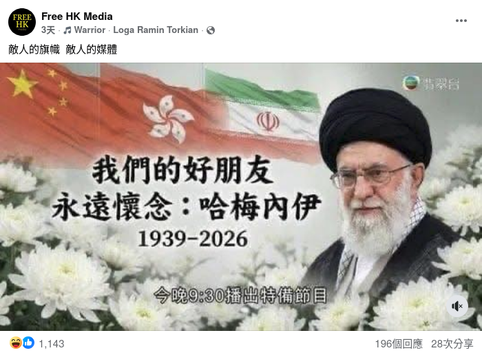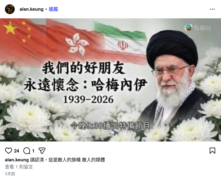 2026年3月3日,Threads用戶「姜嘉偉」發佈圖片,顯示為無綫電(TVB)視(TVB)翡翠台的畫面截圖,當中顯示哈梅內伊的照片,正中間為文字「我們的好朋友 永遠懷念:哈梅內伊 1939-2026」,下方字幕則顯示「今晚9:30播出特備節目」。「姜嘉偉」表示「請認清,這是敵人的旗幟 敵人的媒體」,有用戶留言質疑圖片真偽,亦有用戶認為圖片屬實。帖文獲652個讚好、74個留言、337次分享及逾4萬次瀏覽。[2]