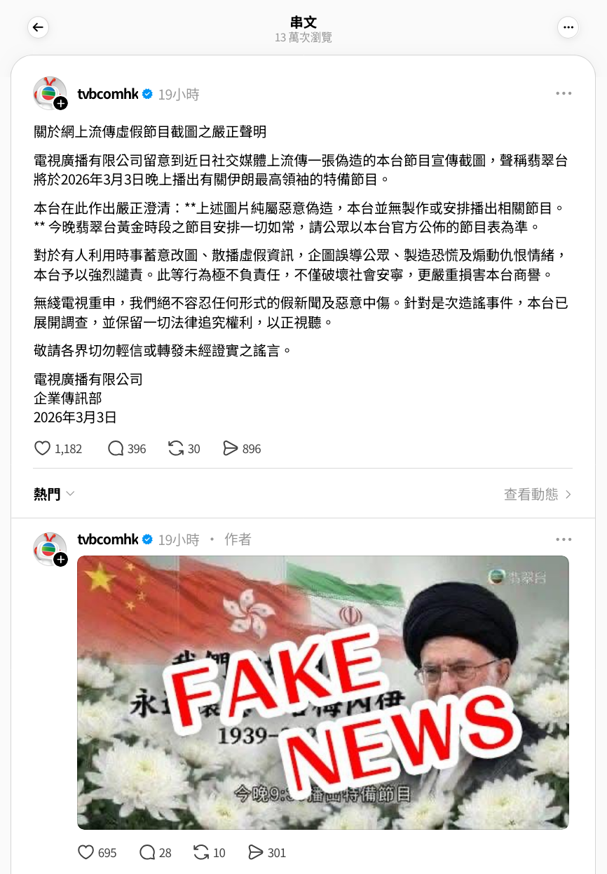 2026年3月3日,TVB於其網站上發佈聲明,表示該公司「留意到近日社交媒體上流傳一張偽造的本台節目宣傳截圖,聲稱翡翠台將於 2026 年 3 月 3 日晚上播出有關伊朗最高領袖的特備節目」,並指該圖片「純屬惡意偽造」及澄清翡翠台「並無製作或安排播出相關節目」。[11]TVB亦於其Threads帳戶貼出有關聲明,並留言貼出網傳圖片並加上「FAKE NEWS」兩字。[12,13]