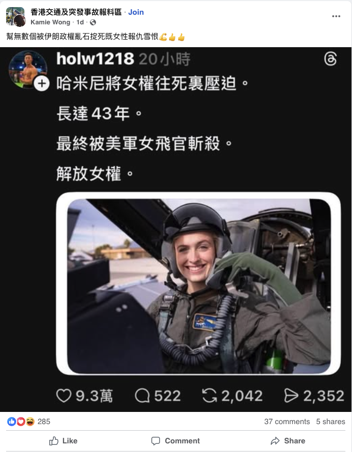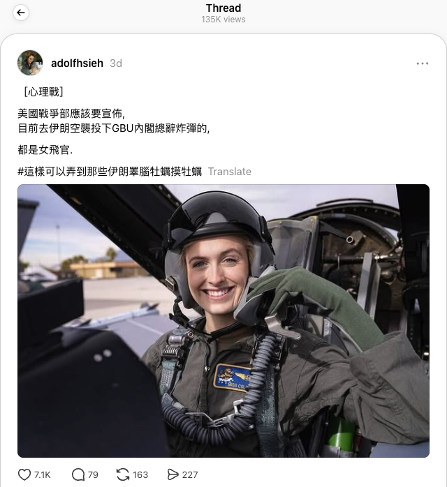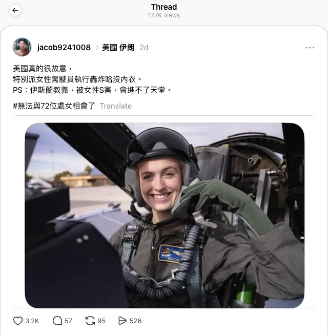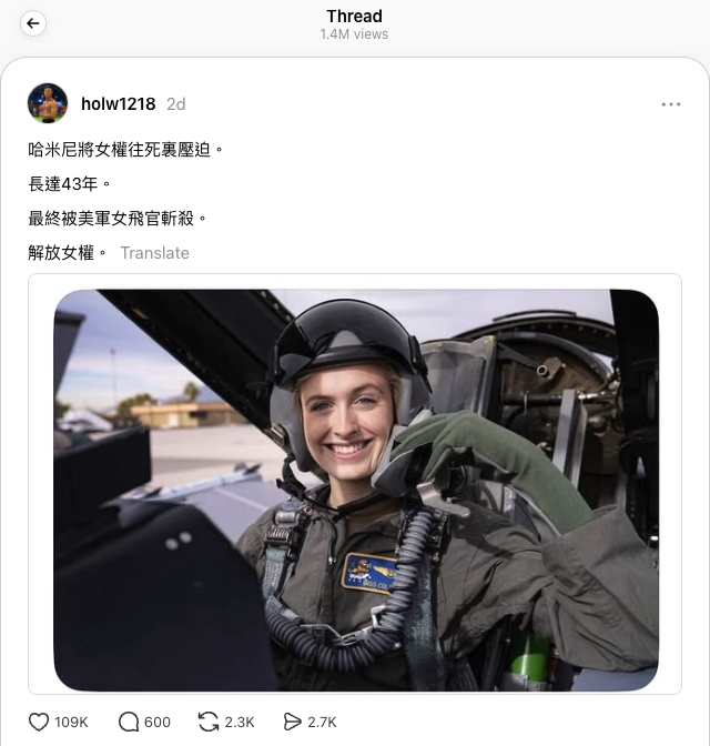 2026年3月1日下午,Threads用戶「holw1218」發佈帖文宣稱哈梅內伊(帖文譯為哈米尼)被美國空軍女飛行員殺死,並貼出一張女飛行員坐在機艙內的圖片。帖文獲得近11萬個讚好、600個留言、約5,000次轉發分享以及逾140萬次瀏覽。[2]