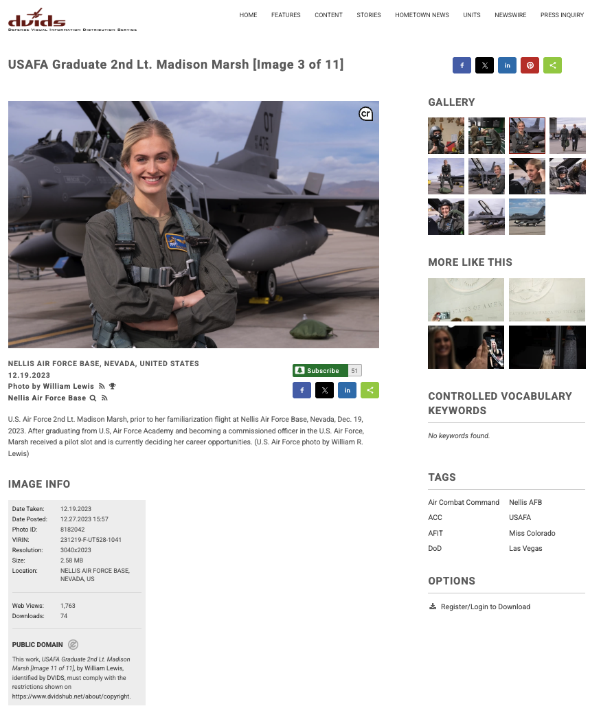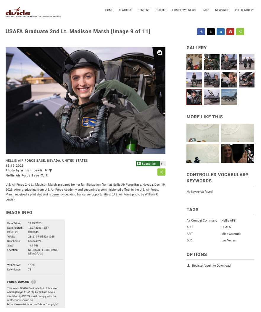 逆向搜尋圖片結果亦包括美國國防部(Department of Defense, DoD)旗下視覺資訊平台DVIDS(Defense Visual Information Distribution Service)2023年12月19日發佈的圖片集,根據標題圖中為美國空軍學院畢業生少尉麥迪遜·馬殊(Madison Marsh)。圖片集共包括11張照片,其中第9張圖片與網傳圖片相同。資訊欄顯示照片拍攝於2023年12月19日內華達州奈利斯空軍基地(Nellis Air Force Base),發佈於2023年12月27日。[9]