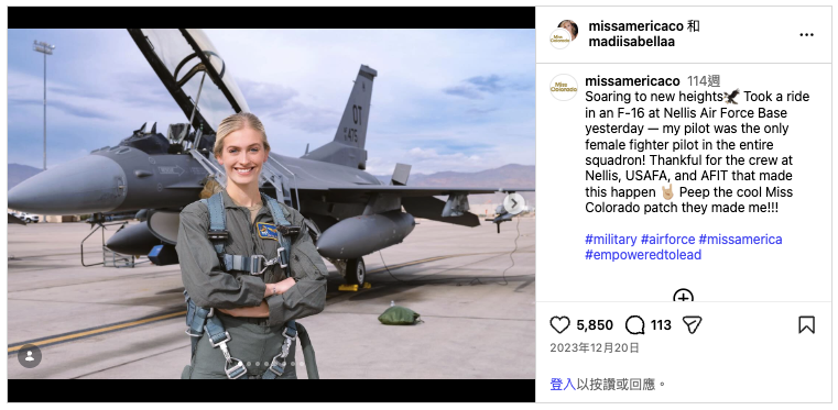 在Google搜尋「Madison Marsh」,可找到Instagram用戶「madiisabellaa」,其帳戶簡介寫到「美國空軍學院2023屆」(USAFA 23)。[10]翻查帳戶可找到2023年12月21日發佈的圖片,照片中的人物被標註了Instagram帳戶「madiisabellaa」。[11]同時,該圖片與DVIDS圖片集中第3張圖一致,包括圖中人物的服裝、動作等細節,惟Instagram照片顯示更多背景畫面。DVIDS資訊欄顯示,該照片拍攝於2023年12月19日,發佈於2023年12月27日。[12]綜合以上資料可確認該Instagram帳戶屬於馬殊。