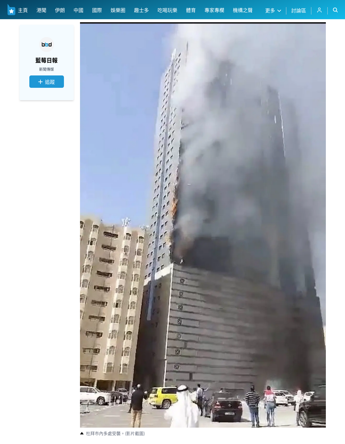 網媒《藍莓日報》於2026年03月01日發佈杜拜機場遇襲導致旅客滯留的文章,其中包含相同片段截圖,圖片下方文字簡介稱杜拜巿內多處受襲。[6]