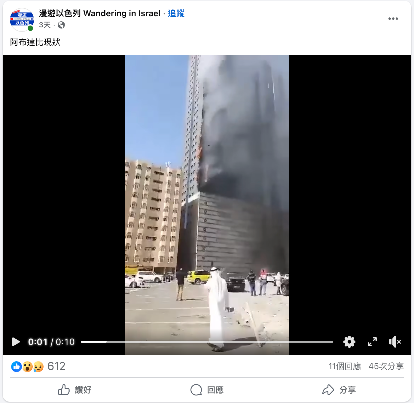 2026年3月1日,Facebook專頁「漫遊以色列 Wandering in Israel」發佈相同影片,但聲稱片段顯示阿聯酋首都阿布達比(Abu Dhabi)的現狀。[4]以上兩則帖文共獲得816個表情反應、24個回應及75次分享。