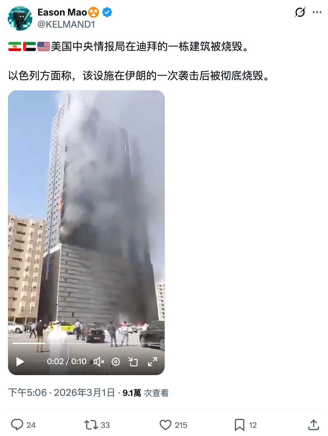 相同片段亦於其他平台傳播。2026年3月1日,X(前稱Twitter)用戶「Eason Mao」發佈相同片段,聲稱伊朗襲擊了位於杜拜的美國中央情報局總部。帖文獲得215個讚好、24個留言、33次轉發以及9.1萬次查看。[5]
