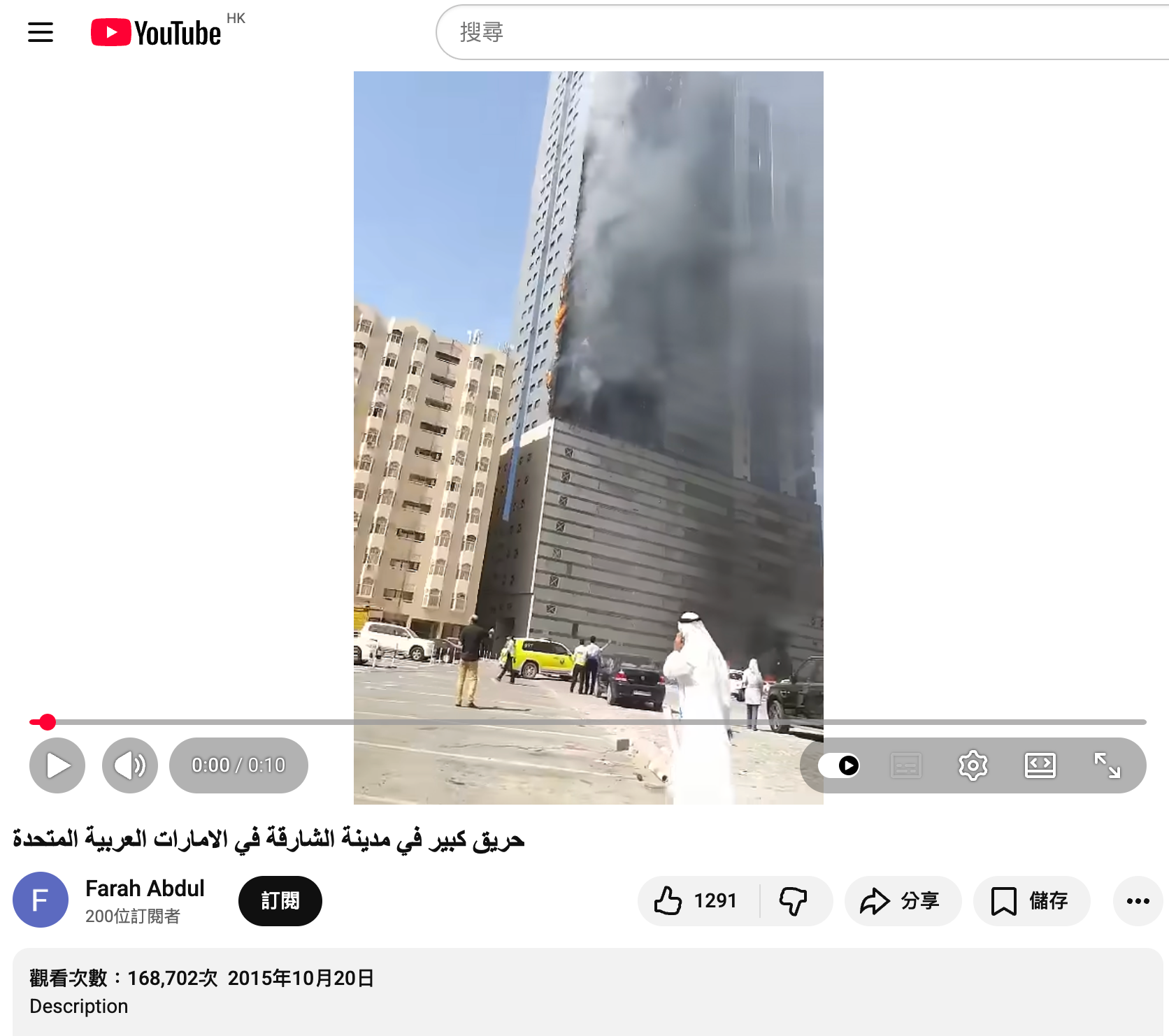 上述帖文均未註明出處。使用Google逆向搜尋網傳片段截圖,可發現YouTube用戶「Farah Abdul」發佈於2015年10月20日的影片,與網傳片段相同。[7]影片標題為阿拉伯文,使用Google翻譯理解,大意為阿聯酋城市沙迦(Sharjah)發生大火。[8]該片段於2015年便在網絡傳播,不可能為2026年2月美國與以色列聯手攻擊伊朗後的事件。