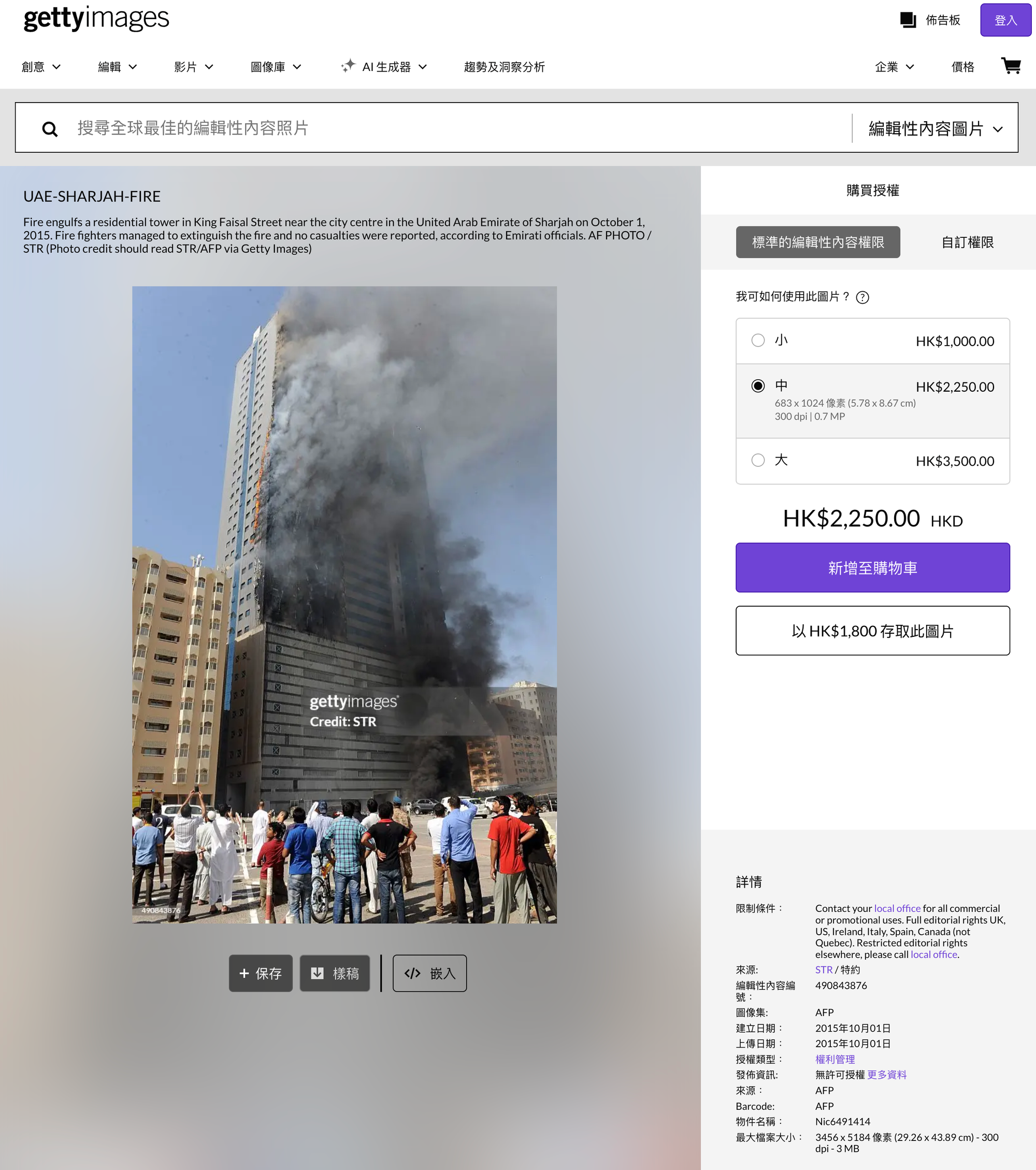 另一Google搜尋結果為圖庫網站Getty Images一張源自《法新社》(AFP)的照片,當中的建築物外觀同樣與網傳圖片一致。照片簡介顯示,2015年10月1日,阿聯酋沙迦市中心費瑟國王街(King Faisal Street)附近一住宅建築發生火災。[12]