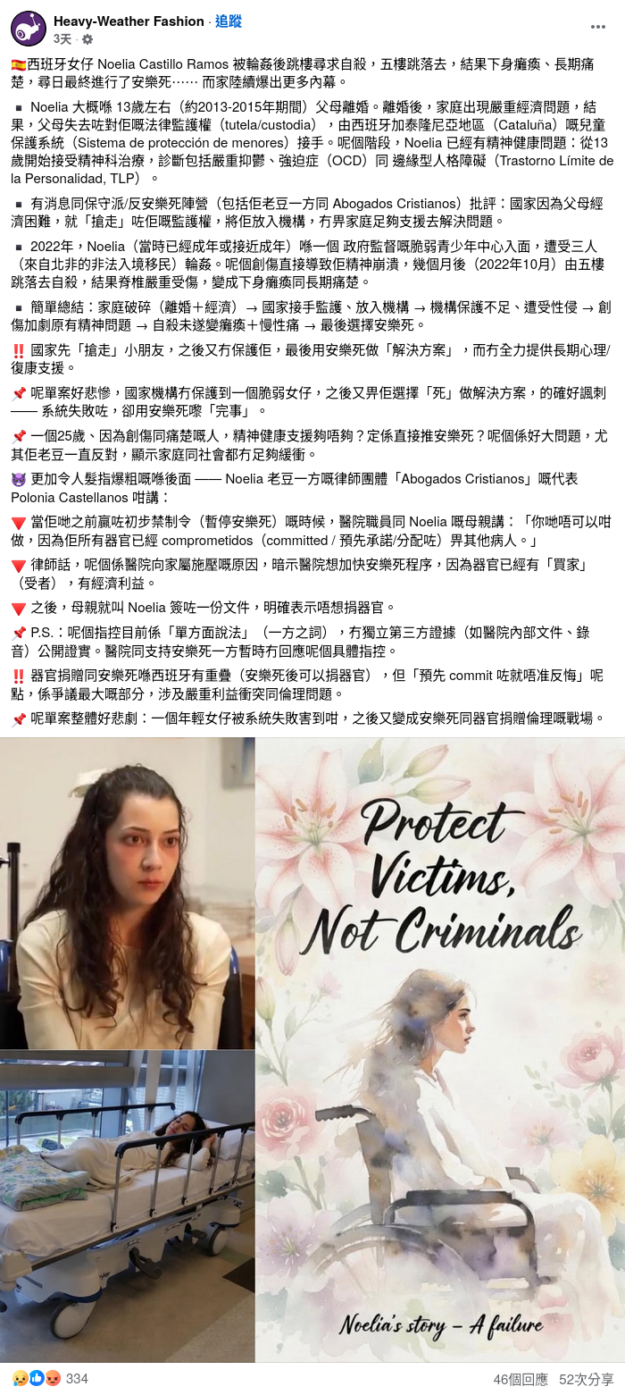 西班牙25歲女子卡斯提洛(Noelia Castillo)安樂死的申請曾被父親嘗試透過法律程序阻止,她最終勝訴,於2026年3月接受藥物注射離世。