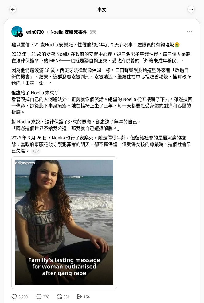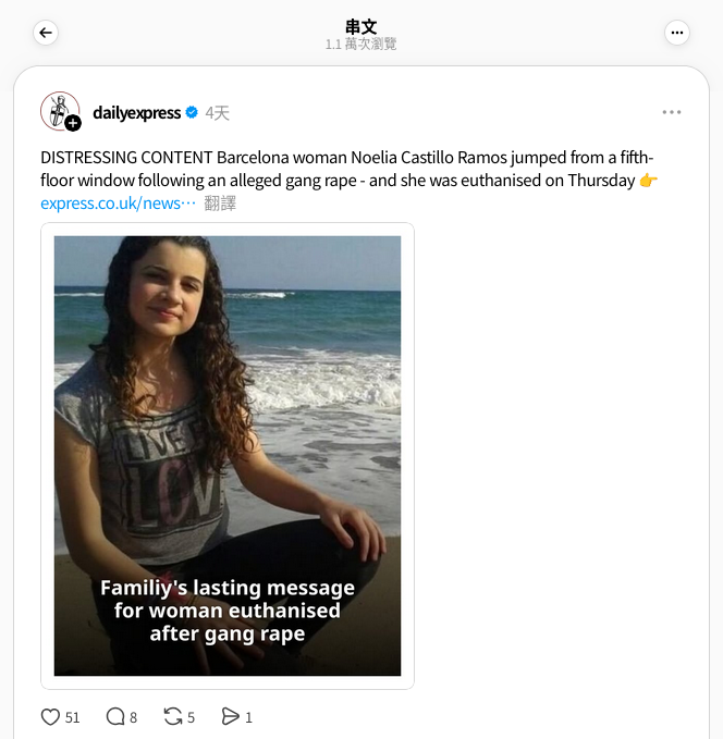 「erin0720」的帖文圖片轉發自英國《每日快報》(Daily Express)的Threads帖文[11],該帖文附上《每日快報》的網站連結[12],點擊可見為卡斯提洛安樂死的報導,惟當中同樣沒有提及她被「外籍未成年移民」性侵。[13]