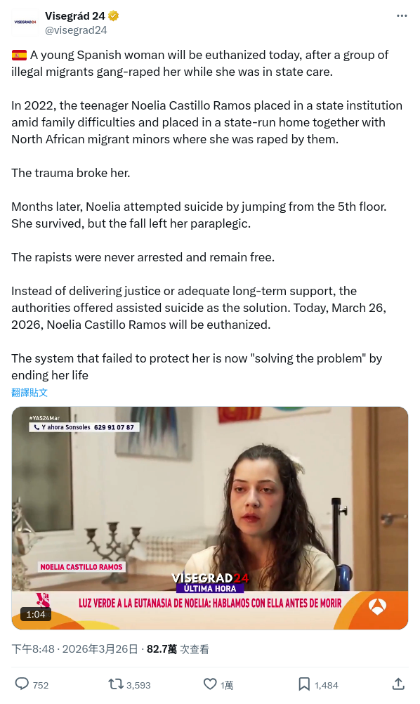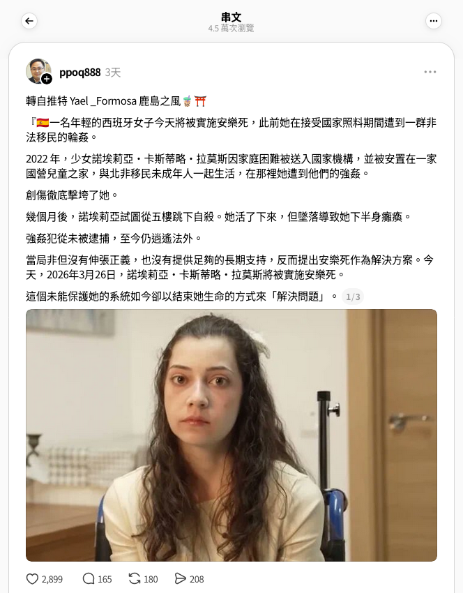 同日Threads用戶「蔡淵州」,宣稱卡斯提洛(帖文譯作「卡斯蒂略」)於2022年「被安置在一家國營兒童之家,與北非移民未成年人一起生活,在那裡她遭到他們的強姦」。帖文又指當局「提出安樂死作為解決方案」以及卡斯提洛於3月26日「被實施安樂死」。帖文獲得2,899個讚好、163個留言、388次分享及4.5萬次瀏覽。[4]