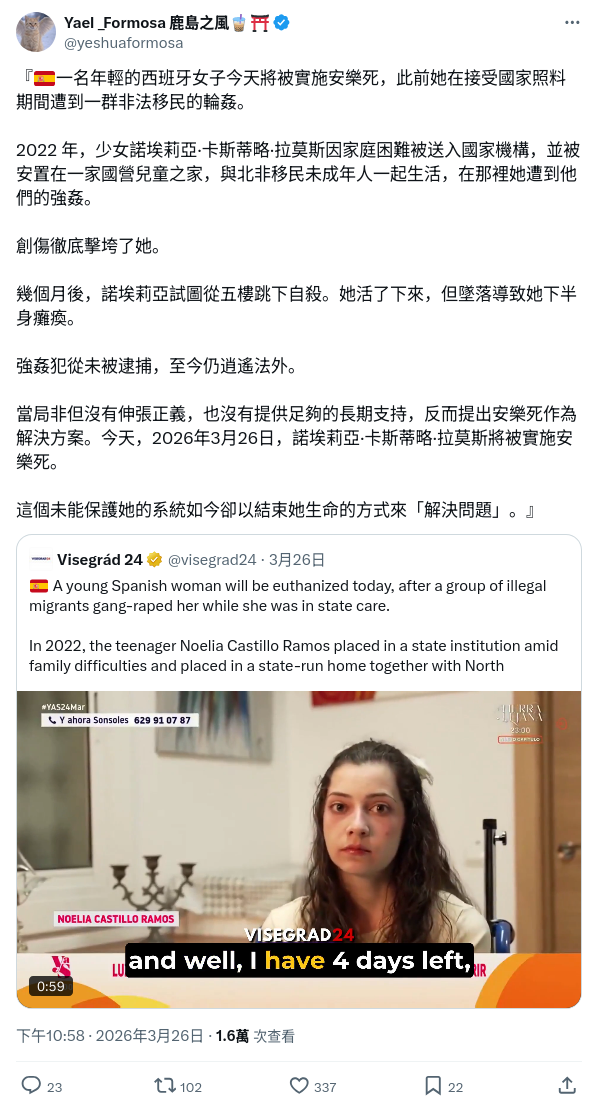 - 西班牙25歲女子卡斯提洛(Noelia Castillo)安樂死的申請曾被父親嘗試透過法律程序阻止,她最終勝訴,於2026年3月接受藥物注射離世。