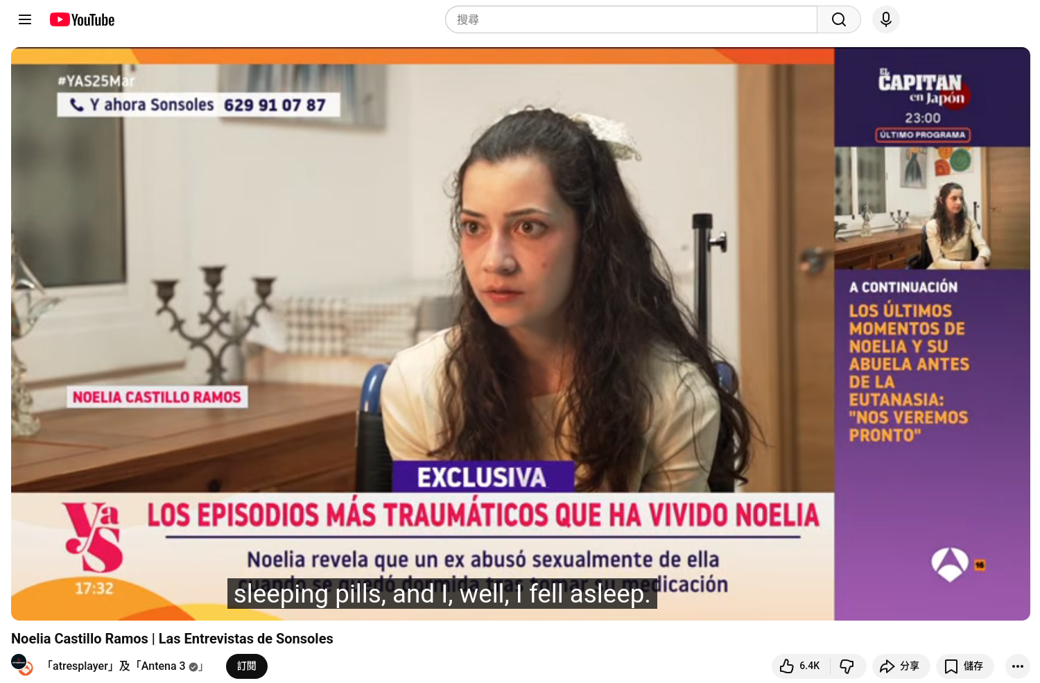 - 見[18]影片第22分21秒至23分01秒,相關自動翻譯字幕為「For four years, I was in a relationship with a guy who, according to Noelia, ended up abusing her while she was asleep. I took my sleeping pills, and I, well, I fell asleep. Then he took advantage of me, and the next day he told me about it as if it were something normal. I was asleep, I knew I felt something, but I didn't know what I felt and I couldn't move because I was asleep, half asleep, asleep. And the next day [he] told me about it, laughing.」,粗體為卡斯提洛發言,最後一個「he」字幕顯示為「she」,按前文後理修正。