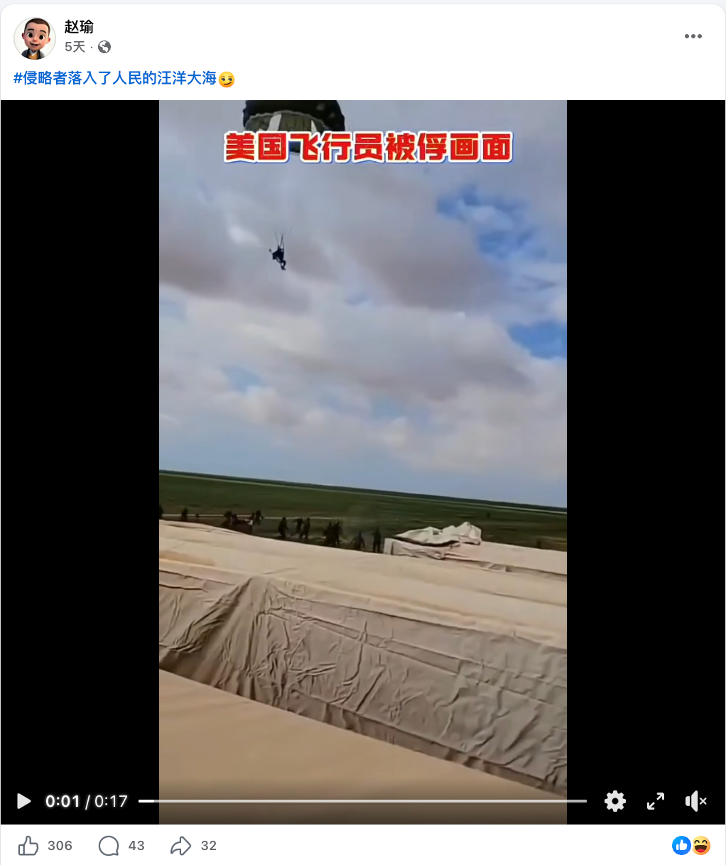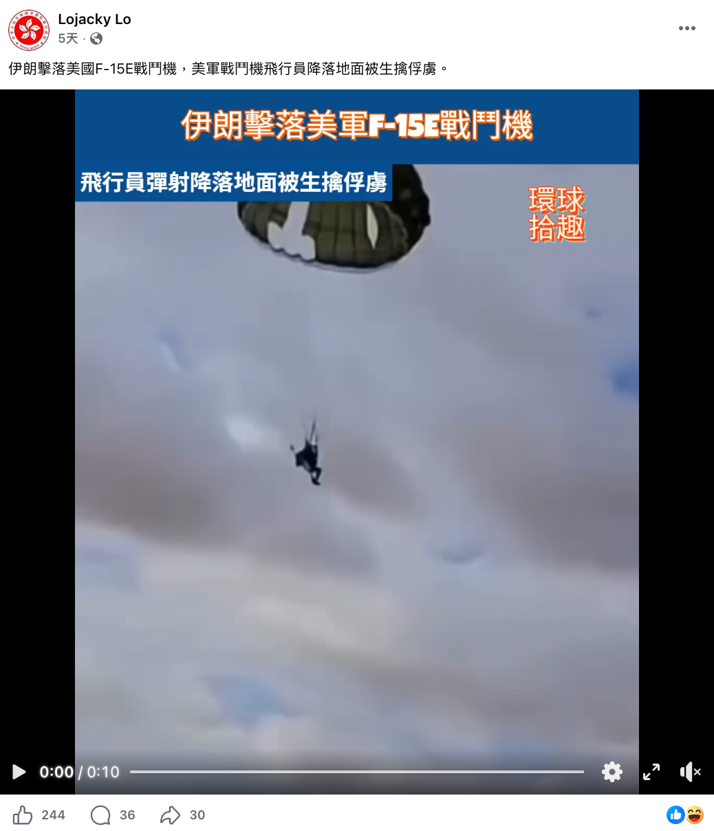 2026年4月3日,一架在伊朗上空飛行的美國F-15戰鬥機遭擊落。[1]4月5日,Facebook用戶「Lojacky Lo」發佈一段飛行員乘降落傘落在地面的影片,片中標題為「伊朗擊落美軍F-15E戰鬥機」並附小標題「飛行員彈射降落地面被生擒俘虜」。[2]Facebook用戶「赵瑜」於同日發佈畫面更完整的影片,上下方顯示更多內容,片中顯示紅字「美国飞行员被俘画面」。[3]以上兩則帖文共獲得550個表情反應、79個回應及62次分享。