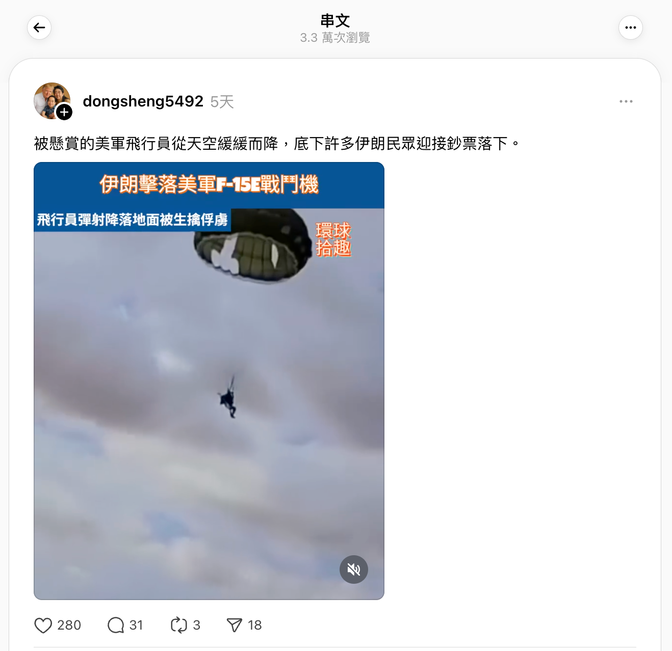 2026年4月3日,一架在伊朗上空飛行的美國F-15戰鬥機遭擊落。社交媒體流傳一段飛行員乘降落傘落在地面的影片,帖文聲稱片段顯示伊朗擊落美軍F-15E戰機後飛行員被俘。