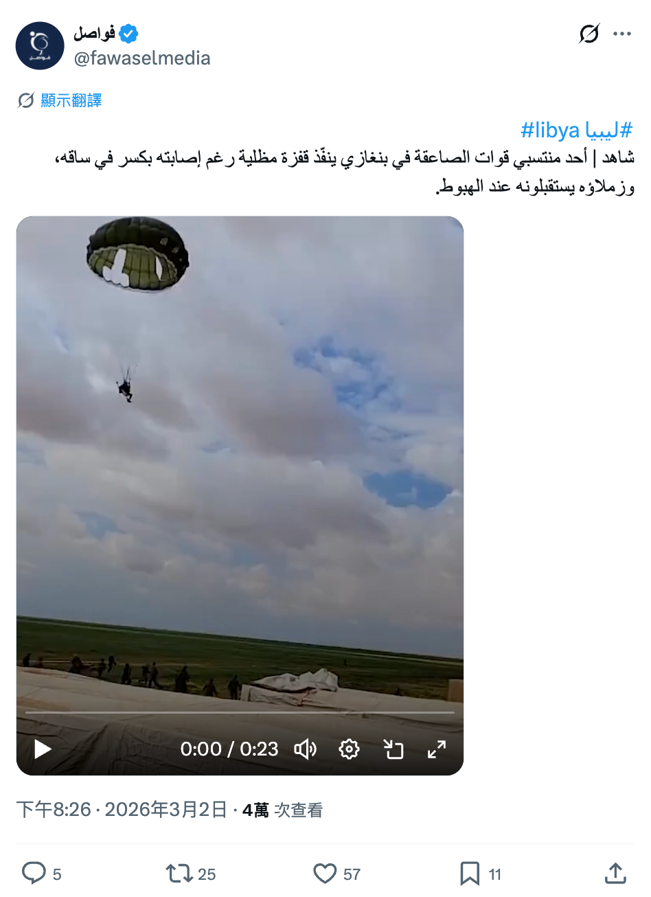 - 影片中跳傘的飛行員向《法新社》證實,片段顯示2026年3月1日利比亞軍事訓練時,其他士兵聚集在一起幫助腿部骨折的他降落。