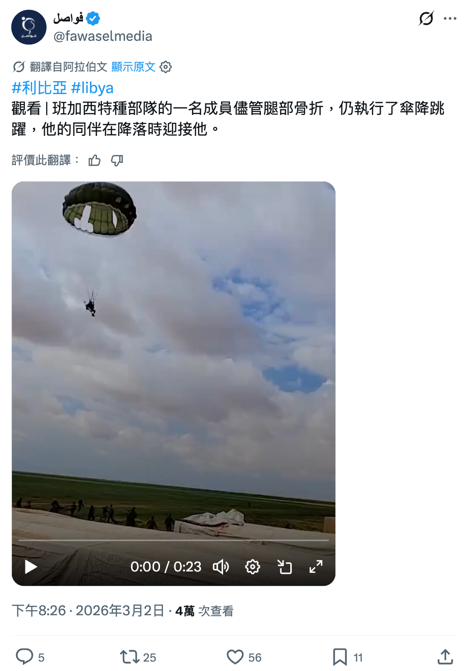 - X用戶「فواصل」(@fawaselmedia)2026年3月2日帖文,MediaVault備份網頁。原文為「#ليبيا #libya شاهد | أحد منتسبي قوات الصاعقة في بنغازي ينفّذ قفزة مظلية رغم إصابته بكسر في ساقه، وزملاؤه يستقبلونه عند الهبوط.」。使用X內置AI工具「Grok」中文翻譯結果為「#利比亞 #libya 觀看 | 班加西特種部隊的一名成員儘管腿部骨折,仍執行了傘降跳躍,他的同伴在降落時迎接他。」