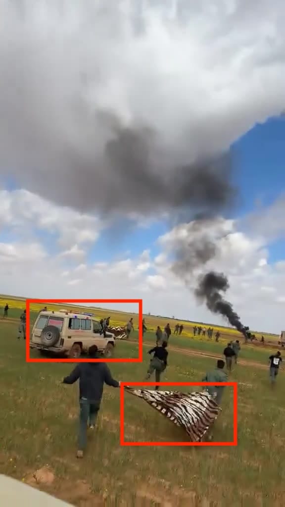 使用Google逆向搜尋網傳片段截圖,可發現利比亞媒體《Fawasel Media》(阿拉伯語:فواصل)於2026年3月2日在X(前稱Twitter)發佈的影片。[7]從影片發佈時間可見,內容不可能為2026年4月美國F-15戰鬥機遭擊落一事。帖文使用阿拉伯語,根據X內置AI工具「Grok」提供的中文翻譯,內容為利比亞城市班加西的特種部隊成員在腿部骨折情況下仍跳傘,同伴在降落時迎接。