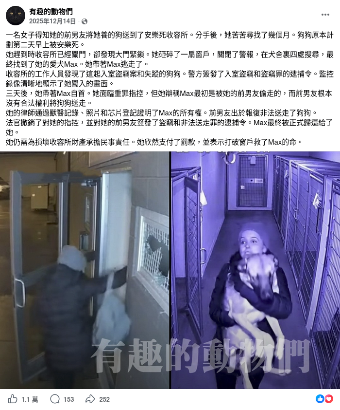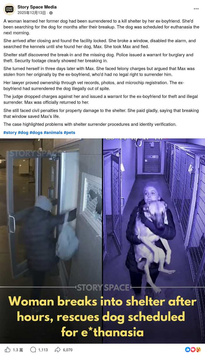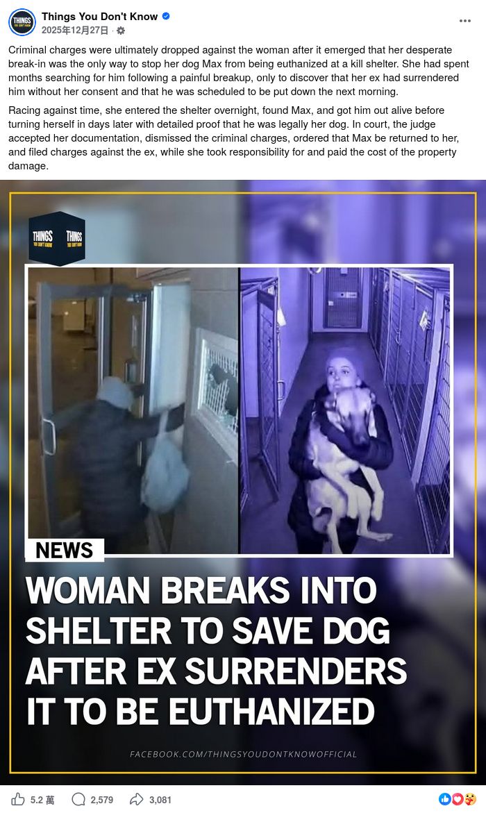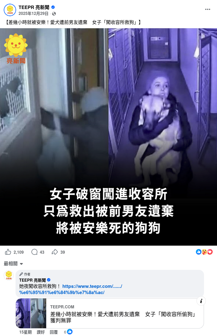 「TEEPR 亮新聞」的Facebook專頁於2025年12月29日亦發佈相關帖文,附圖為上述兩張圖片合併,顯示文字「女子破窗闖進收容所 只為救出被前男友遺棄 將被安樂死的狗狗」。帖文獲得2,109個讚好、43個留言及39次分享。[2]