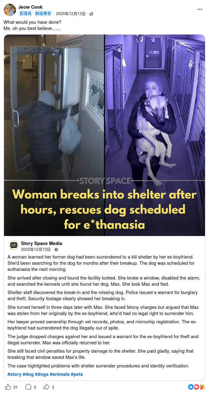 2025年12月14日,Facebook專頁「有趣的動物們」已發佈類似訊息,同樣宣稱一名女子得悉前男友把她養的狗Max送到收容所,發現按計劃Max第二天早上被終止生命,而當時收容所已關門,故破窗闖進把狗救出,其後自首。帖文又指法官撤銷該女子的控罪,並對其前男友發出逮捕令,但該女子仍須為損壞收容所財產承擔民事責任。帖文附圖同樣為上述兩張圖片合併,惟兩張圖片左右方向均不同。帖文獲得逾1.1萬個表情反應、153個留言及252次分享。[3]